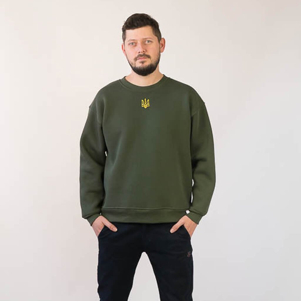 Стильная новинка нашего интернет-магазина "Арлекин" Вам точно понравится. Мужской джемпер цвета хаки из полотна трехнитка на флисе представляет собой превосходное решение для холодного времени года. Данный материал гарантирует отличную теплоизоляцию, что делает свитшот незаменимым в прохладные дни. Горловина, манжеты и нижняя часть джемпера выполнены из эластичной резинки, что обеспечивает хорошее прилегание и предотвращает проникновение холодного воздуха. Патриотический символ в виде Герба на груди прекрасно дополняет представленный джемпер.