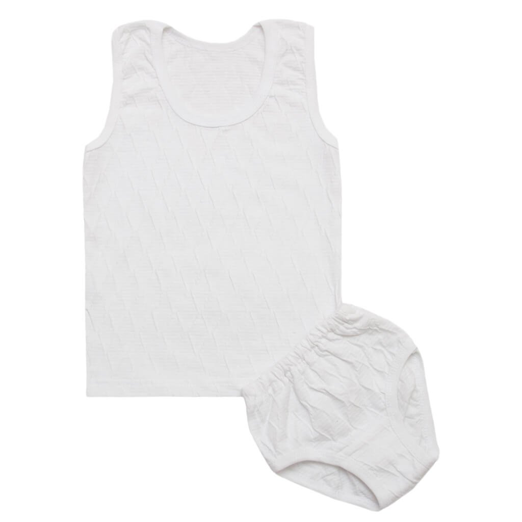 Белый комплект нижнего белья из мягкой и приятной ткани - идеальный выбор для Ваших малышей. Полотно, из которой пошита данная модель - жатка. Данный материал отлично подходит для изготовления нательной детской одежды, так как имеет полностью натуральный состав. Ткань жатка также имеет очень красивую «мятую» структуру, благодаря чему изделия выглядят достаточно необычно. Базовые модели майки и трусиков - необходимые элементы гардероба каждого малыша. На нашем сайте торговой марки «Арлекин» Вы найдёте самую разнообразную и стильную одежду для своих детишек!