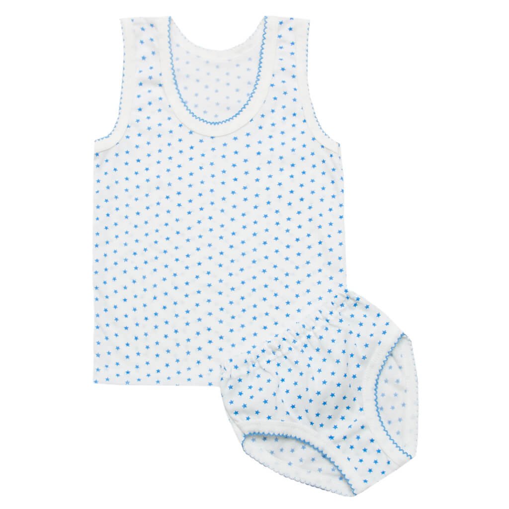 Комплект для девочки изготовлен из хлопчатобумажного полотна - кулир, принт синие звезды. Горловина, лямки на майке и трусики, обработаны ажурным шитьем - крошетта. В таком полотне меньше всего используются красительные вещества, по этому такие изделия нежны на ощупь и оптимально подходят для нательной носки. В таком комплекте ваша малышка будет себя комфортно и во время сна, и во время прогулки. Разнообразные цвета позволят подобрать понравившейся и нужный вам цвет, а может даже несколько. ТМ Арлекин желает вам приятных покупок и хорошего настроения!