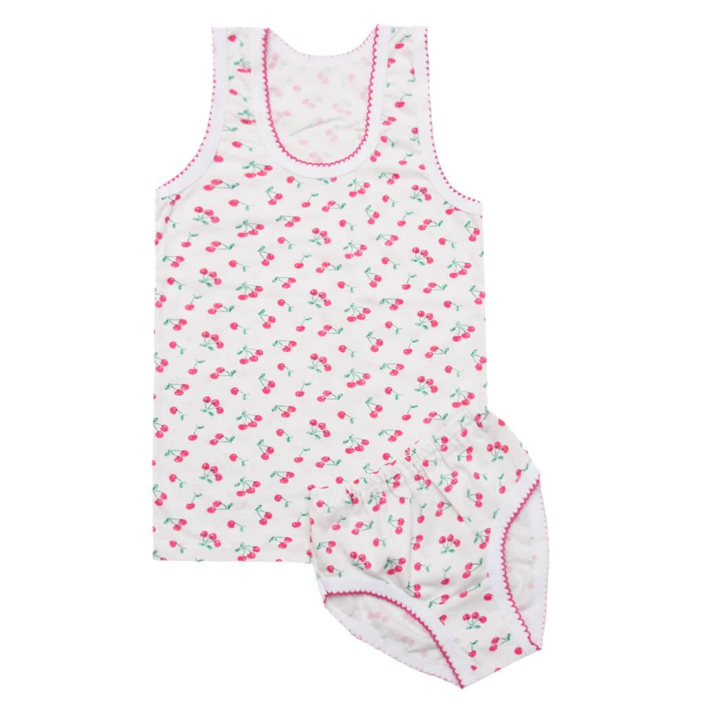 Комплект для девочки изготовлен из хлопчатобумажного полотна - кулир, принт вишенки. Горловина, лямки на майке и трусики, обработаны ажурным шитьем - крошетта. В таком полотне меньше всего используются красительные вещества, по этому такие изделия нежны на ощупь и оптимально подходят для нательной носки. В таком комплекте ваша малышка будет себя комфортно и во время сна, и во время прогулки. Разнообразные цвета позволят подобрать понравившейся и нужный вам цвет, а может даже несколько. ТМ Арлекин желает вам приятных покупок и хорошего настроения!