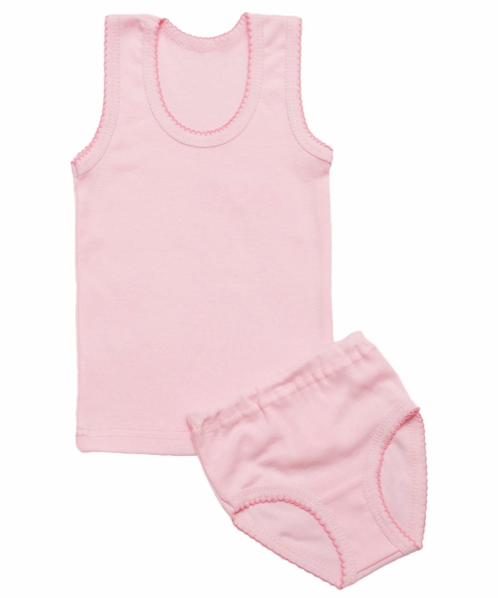 Светло-розовый комплект для девочки в спокойных приятных тонах из рибаны - лучший выбор для Вашей малышки. Полотно, из которого выполнена эта модель – рибана. Оно идеально подходит для нательных детских вещей, очень приятно к телу и имеет высокую степень изнашиваемости, а главное не вызывает аллергических реакций. Такое полотно на 100% состоит из хлопка и прослужит вам весьма долго.  Комплект имеет украшение в виде крашетты по проймам ручек, ножек и горловине. Ваша принцесса будет довольна своим детским бельем. Удобные трусики и стильная майка понравиться вашей капризуле.