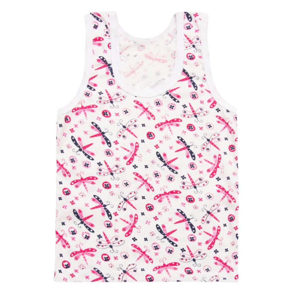 Кулирная майка с простым кроем, без украшений и декора. Майка отлично подходит как нательная поддевка, также в ней можно спать или ходить по дому. Тонкое кулирное полотно, белого цвета, с принтом бабочки, отлично пропускает воздух, дает возможность телу дышать. Ткань плотно прилегает к телу, по этому под одеждой не ерзает и не вызывает неудобств. Майки представлены в различных расцветках девченок, вы можете приобрести себе нужный цвет на любой вкус. ТМ Арлекин предоставляет разнообразную продукцию.