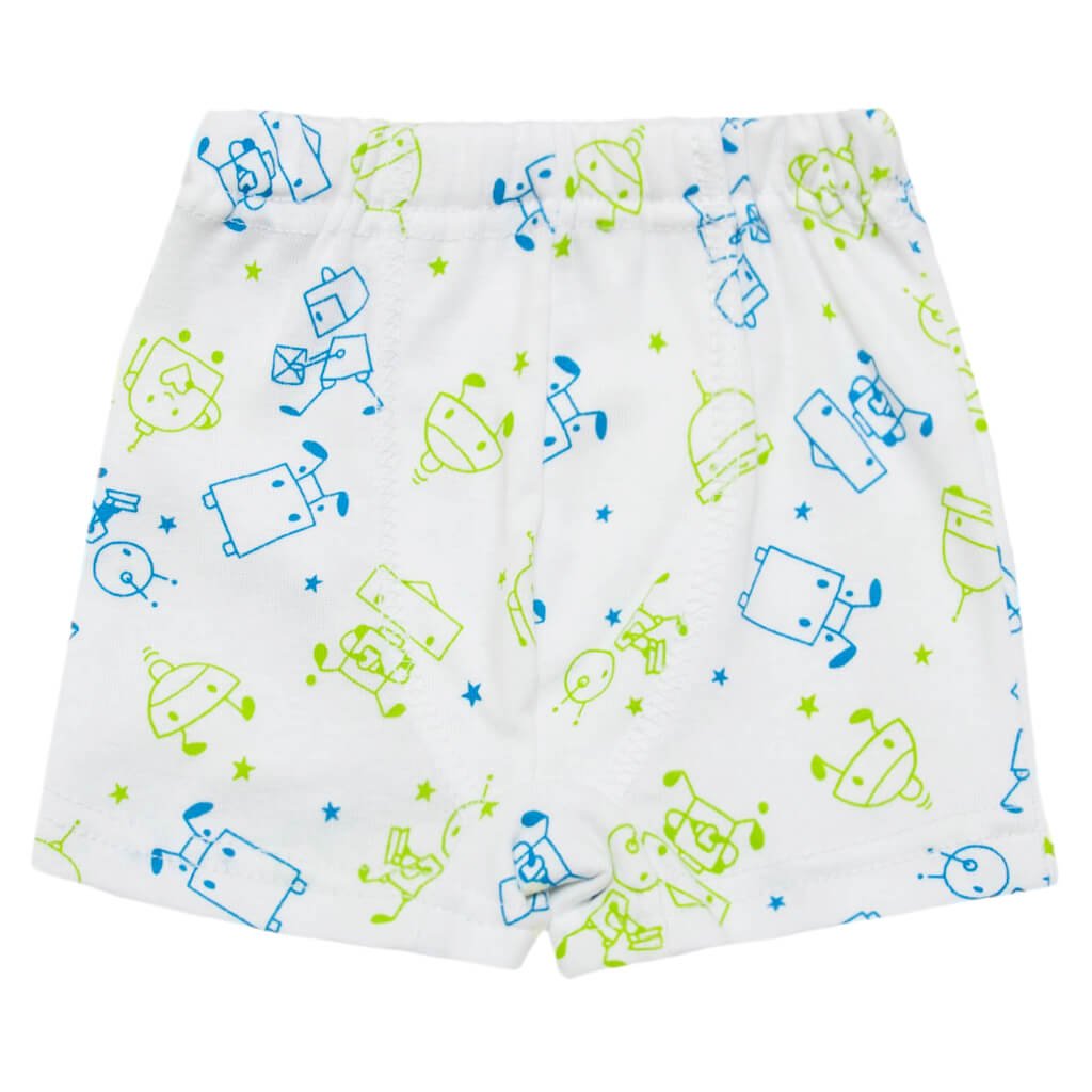 Детские трусы-боксёры для мальчика - всегда актуальный и удобный вариант для ребёнка. Данная модель детских трусиков пошита из высококачественного трикотажного материала - рибаны, белого цвета, принт роботы. Полотно отлично подходит для пошива нательной одежды, так как хорошо пропускает воздух и впитывает влагу. Также такая ткань достаточно долговечная и прочная, и благодаря этому трусики долго прослужат Вашему малышу. На поясе изделия присутствует мягкая резинка, которая ни в коем случае не будет давить и доставлять дискомфорт ребёнку. Трусы-боксёры для мальчика украшены различными рисунками.