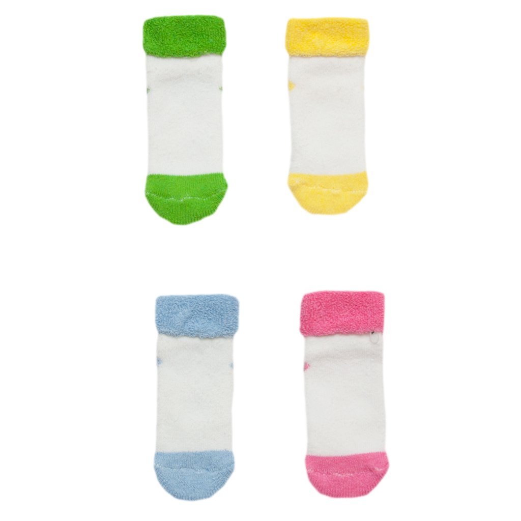 Носочки для новорожденной девочки изготовлены из хлопка (70%), эластана (25%) и ластика (5%). Данная модель изделия комбинирована из двух цветов: нежный белый цвет плюс ярко-красочный. На подошве носочков - антискользящий эффект за счет наклеенных "подушечек" различной формы. Они теплые и комфортные. В этой модели используется только натуральная ткань. Приобретайте все только самое лучшее для своих деток в нашем интернет-магазине! Отличного настроения!