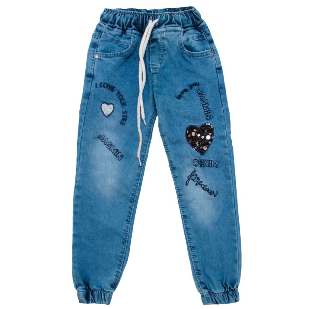 Голубые джинсы на резинке для девочки смотрятся очень стильно и красиво. Детские джинсы джоггеры - тренд последних сезонов! Спереди на обеих штанинах расположены вышитые надписи и рисунки с пайетками - эти декоративные элементы отлично дополняют изделие. По поясу, а также снизу на ноге джинсы фиксируются резинкой. При необходимости на поясе джинсы можно дополнительно затянуть шнурком. Джинсы - это универсальная вещь, которая обязательно должна быть в гардеробе у ребёнка, ведь это не только стильно, но и очень удобно и практично.