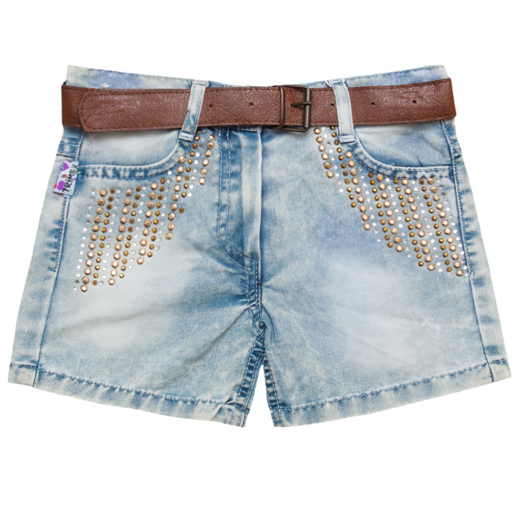 Ваша девочка хочет джинсовые шорты не такие, как у всех? Тогда наш интернет-магазин Вам поможет в этом нелёгком задании. Данная модель пошита из качественного джинса, который хорошо тянется. Поэтому в этих шортах, ребёнку будет удобно и комфортно. Они светлого оттенка, для лета именно то, что нужно. Шорты очень красиво переливаются, так как впереди усыпаны стразами. Есть карманы, которые расположены впереди и сзади. В комплект входит крутой ремень коричневого цвета. Эта модель особенная. Поэтому рекомендуем её приобрести для своей девочки. Приятных покупок!