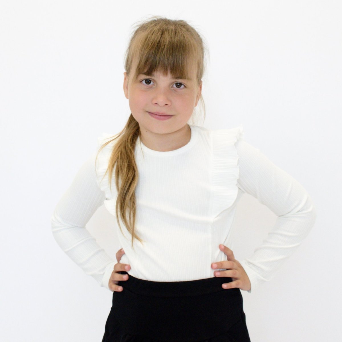 Некоторые вещи сразу привлекают внимание своей утонченностью и аккуратным дизайном, и эта детская блуза именно из их числа. Выполненная из приятного к телу полотна рубчик молочного цвета, она отличается мягкой текстурой и отличной посадкой, что делает её удобной для длительного ношения. Длинные рукава и нежные рюши придают образу утончённости, а застёжка на кнопочку на спинке добавляет удобства при переодевании. Блуза отлично подойдёт как для школьных занятий, так и для особых событий, создавая гармоничный и аккуратный вид. Идеальное сочетание практичности и нарядного стиля.