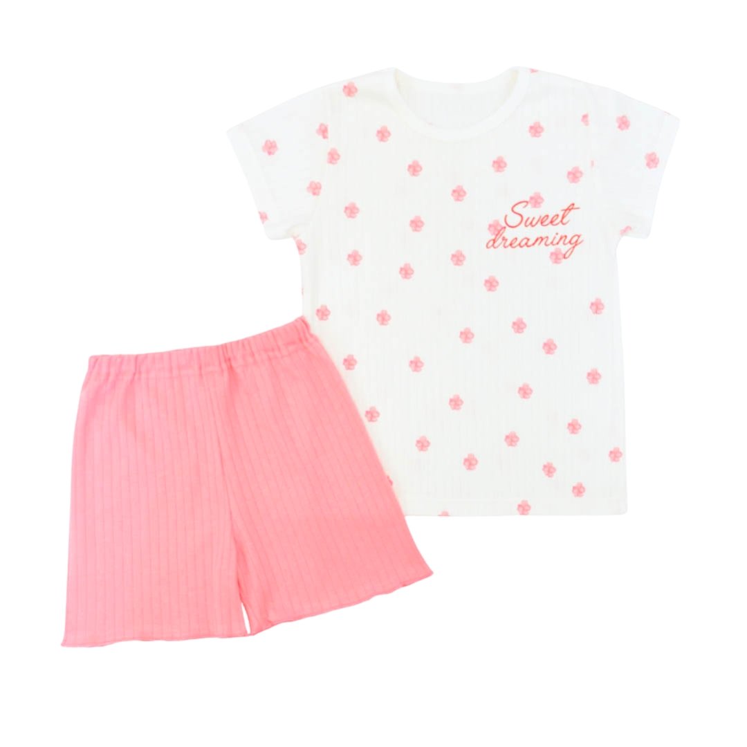 Новый комплект детской пижамы для девочки изготовлен из качественного полотна интерлок рапорт идеально подойдёт для весенне-летнего сезона. Комплект пижамки состоит из футболочки с коротким рукавом молочного цвета с принтом цветочков и лёгких шортиков кораллового цвета, что делает его отличным выбором как для сна, так и для дома. Мягкая, дышащая ткань обеспечивает комфорт, нежно прилегая к коже и предотвращая появление раздражений. Красивые принты и разнообразие расцветок обязательно понравятся маленьким модницам. Шорты на эластичной резинке гарантируют удобство и лёгкость надевания, не сдавливая и не мешая движениям.