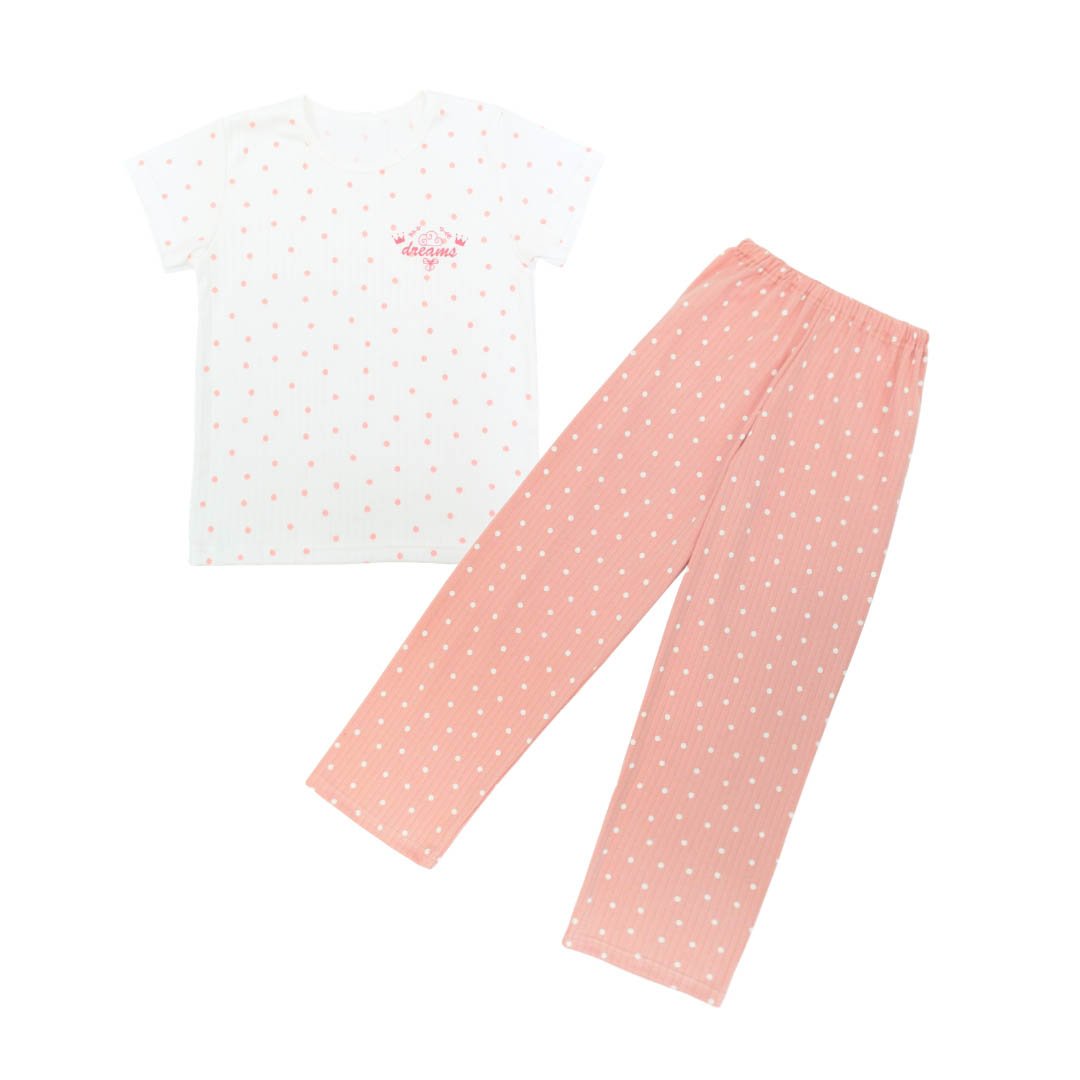 Уют начинается с деталей - особенно в детской одежде для сна, где важна каждая мелочь. Представленный комплект пижамы изготовлен из качественного хлопкового полотна - интерлок рапорт. Данный материал приятен к телу, мягкий, дышащий и не вызывает раздражений даже на самой чувствительной коже. Верх пижамы - молочная футболка с аккуратной покраской и выразительным рисунком горошка, и брюки цвета пыльной розы выполненные со свободным кроем и украшены симпатичным принтом по всему полотну. Эластичный пояс не давит, а ткань отлично тянется, позволяя двигаться свободно во время сна.