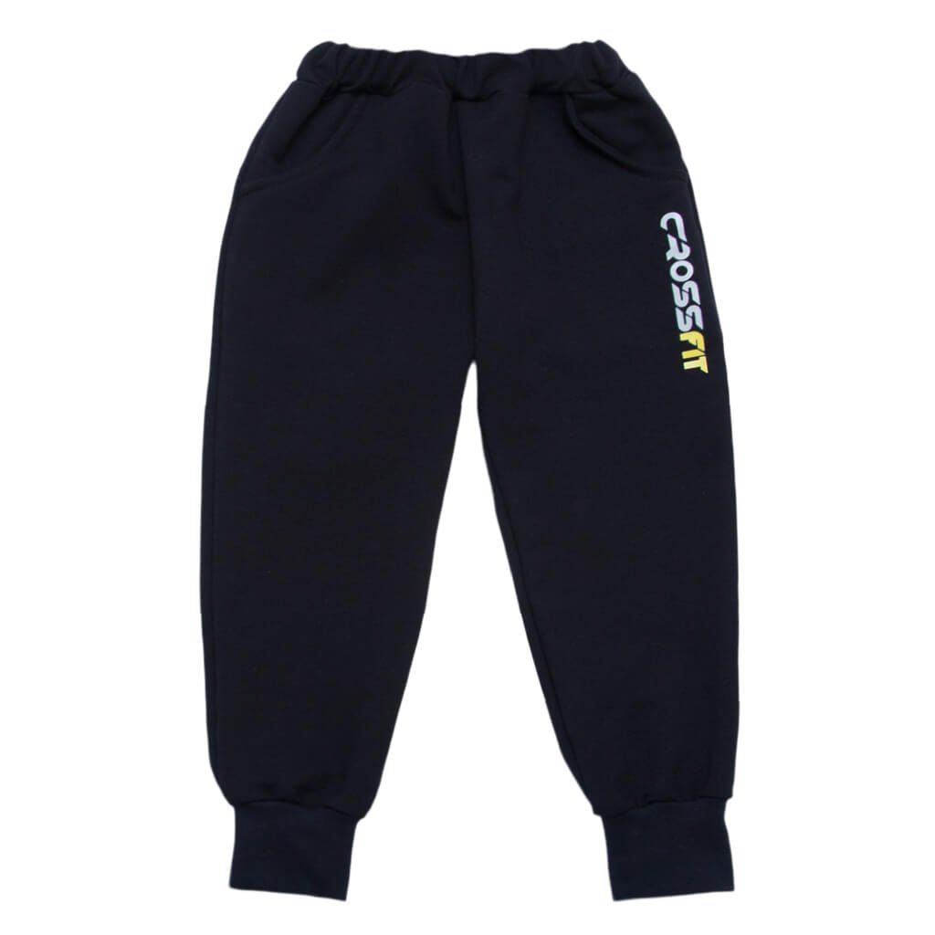 Спортивные детские штаны темно-синего цвета с надписью CROSSFIT пошиты из качественного двухниточного полотна. Полотно довольно плотное, не привередливо в уходе, сильно не мнётся. Изделия из такого полотна долго сохраняют свой первоначальный цвет и форму. Модель штанов интересная и стильная, к низу штанины заужены, что очень модно в этом сезоне. По низу штанов манжеты из эластичного стрейча. По бокам штанов есть карманы. Украшает изделие покраска по переду штанов. В таких брюках Ваш ребёнок будет самым стильным и модным среди сверстников.