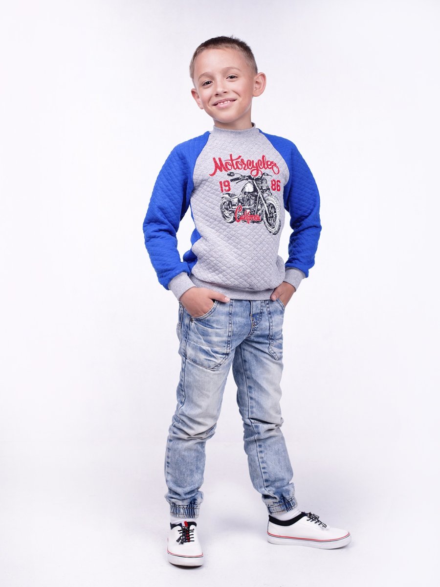 Джемпер для мальчика выполнен из полотна - капитон. Данное полотно комфортное в носке, а утеплитель хорошо сохраняет тепло. Красивая и качественная структура полотна позволяет изготавливать из него теплые и одновременно модные вещи. Джемпер комбинирован из двух цветов полотен. По переду - стойкая и качественная покраска. По низу рукавов и джемпера - манжеты из эластичного полотна. Легко переносит стирку и долго сохраняет свой прежний внешний вид. Приятных покупок!