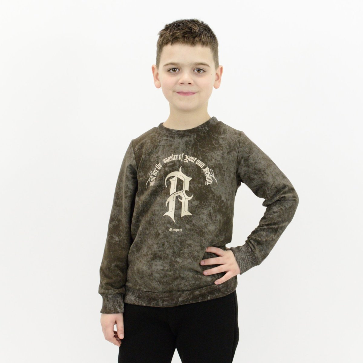 Представленная модель детского джемпера выполнена из полотна двухнитка шоколадного цвета с надписью Respect. Материал приятный к телу, хорошо держит форму и подходит для активного повседневного ношения. По всей поверхности ткани расположен стильный принт, который гармонично дополняет покраску попереду Свободный крой обеспечивает комфортную посадку и не ограничивает движения ребёнка во время игр, прогулок или занятий. Манжеты по низу изделия и на рукавах аккуратно фиксируют изделие. Материал устойчив к износу, не скатывается и остаётся приятным на ощупь. Джемпер представлен в нескольких расцветках, что позволяет легко подобрать вариант под любой гардероб.
