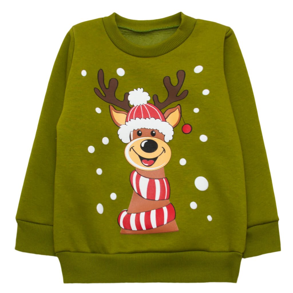Джемпер - очень практичная вещь и пользуется спросом среди детишек. Новая модная модель уже появилась на нашем сайте. Данный джемпер, оливкового цвета с новогодним оленем, изготовлен из приятного и высококачественного полотна - трехнитка. Полотно утеплённое, такую кофточку ребёнок сможет носить в прохладное время года. По низу, рукавов и горловине присутствуют манжеты. Придаёт разнообразности красивая покраска спереди. Расцветки данной модели Вы сможете подобрать и мальчику, и девочке. Такой джемпер можно легко комбинировать с различными джинсами или брюками, которые есть в других разделах нашего интернет-магазина «Арлекин».