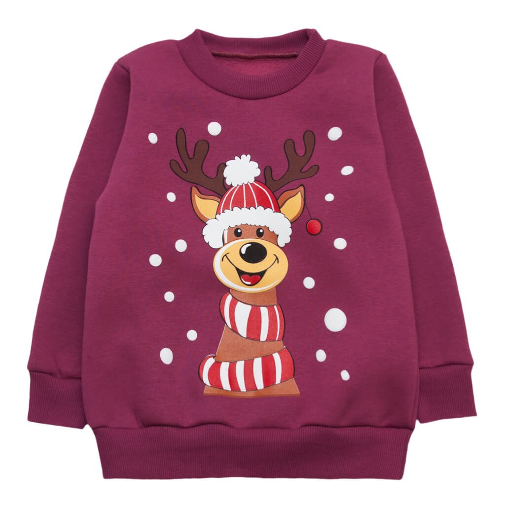 Джемпер - очень практичная вещь и пользуется спросом среди детишек. Новая модная модель уже появилась на нашем сайте. Данный джемпер, сливового цвета с рисунком новогоднего оленя, изготовлен из приятного и высококачественного полотна - трехнитка. Полотно утеплённое, такую кофточку ребёнок сможет носить в прохладное время года. По низу, рукавов и горловине присутствуют манжеты. Придаёт разнообразности красивая покраска спереди. Расцветки данной модели Вы сможете подобрать и мальчику, и девочке. Такой джемпер можно легко комбинировать с различными джинсами или брюками, которые есть в других разделах нашего интернет-магазина «Арлекин».