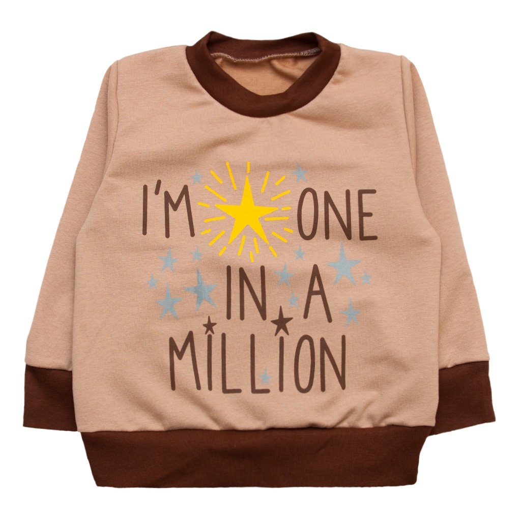 У каждого мальчишки должны быть современные и качественные вещи. В нашем интернет-магазине только лучшие новинки. Джемпер для настоящих модников изготовлен из высококачественной двухнитки. Такой материал подойдет для весны и осени - то есть для демисезонного периода. Дополняет джемпер яркая покраска "Я один на миллион" спереди. Также есть манжеты на руках, горловине и понизу. Представленный джемпер в бежевом цвете точно не оставит равнодушным Вас и Вашего маленького модника. «Арлекин» с заботой относится ко всем своим клиентам! Удачных покупок.
