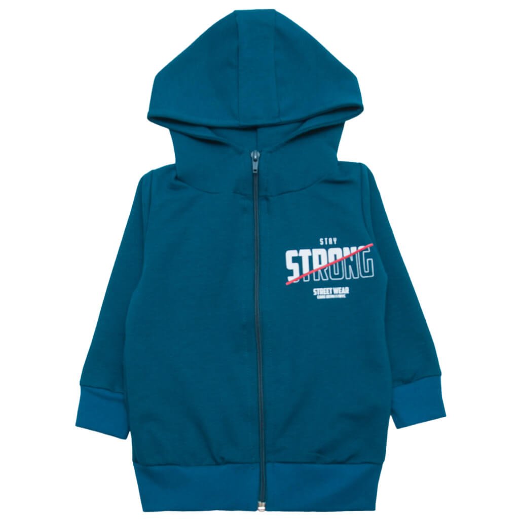 Детишкам необходимо иметь в своём гардеробе удобную одежду, которая будет отлично подходить для активного времяпровождения и занятий спортом. Кофта на молнии - универсальный вид спортивной одежды, которая подойдёт абсолютно всем. Представленная модель бирюзовой детской кофты пошита из высококачественного трикотажного полотна - двухнитки. Ткань обладает высокой воздухопроницаемостью и гигроскопичностью. Края рукавов и низ изделия обработаны эластичными манжетами. Данная кофта дополнена уютным капюшоном и небольшой надписью на лицевой стороне.