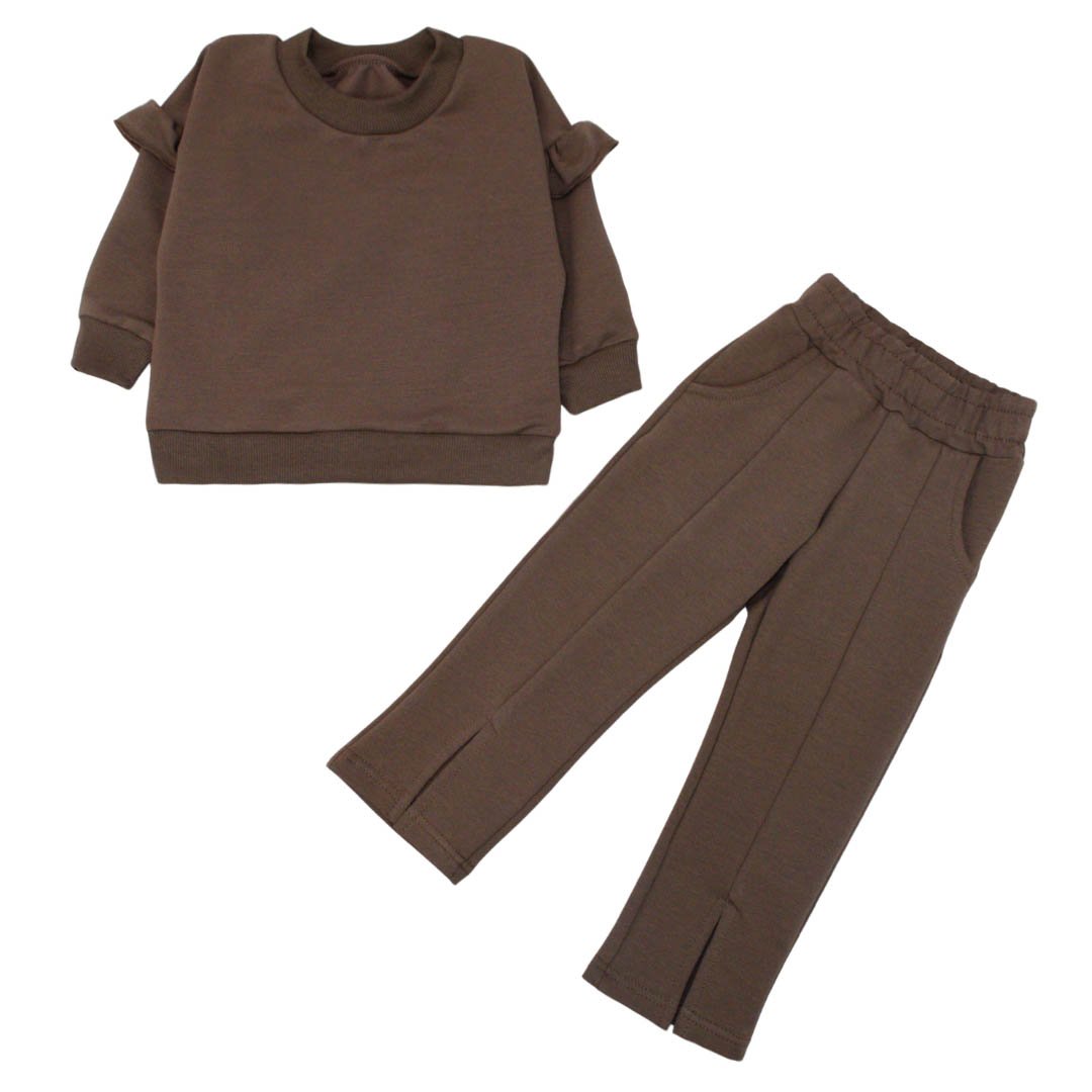 Есть вещи, которые моментально выделяются за счёт деталей, и этот детский костюм для девочки - именно такой вариант. Модель выполнена из мягкого полотна двухнитка цвета мокко, обеспечивающего комфорт и свободу движений в течение всего дня. Однотонная расцветка делает комплект универсальным, а интересные акценты превращают его в стильный выбор для повседневной носки. Джемпер свободного кроя украшен аккуратными крылышками на рукавах. Эластичные манжеты на горловине, рукавах и по низу изделия помогают сохранить форму. Штаны также имеют свободную посадку, дополнены удобными карманами и поясом на резинке.