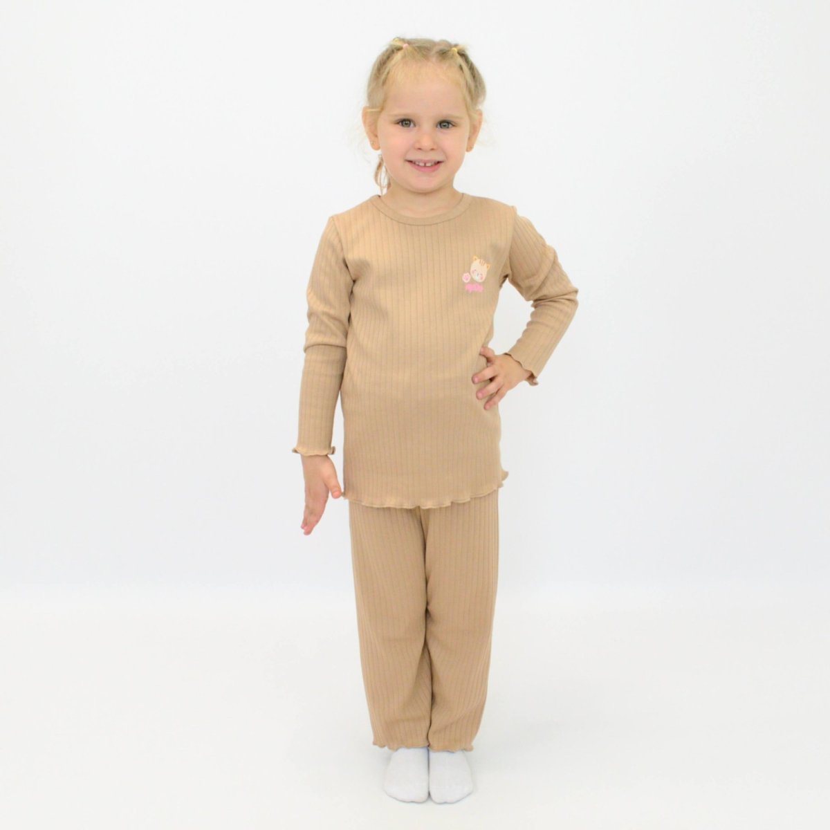 Вещи для девочек должны быть не только удобными, но и вызывать у ребёнка желание носить их каждый день. Этот комплект бежевого цвета с рисунком котика отвечает именно таким ожиданиям. Он выполнен из полотна интерлок рапорт, которое мягко прилегает к телу, хорошо пропускает воздух и подходит для ежедневной носки. В набор входит кофточка с длинным рукавом и свободные штанишки на резинке. Лаконичный однотонный дизайн дополнен небольшим рисунком. Благодаря эластичному поясу штаны удобно сидят и не стесняют движений ребёнка. Такой комплект можно надевать в детский сад, использовать дома или во время прогулок.