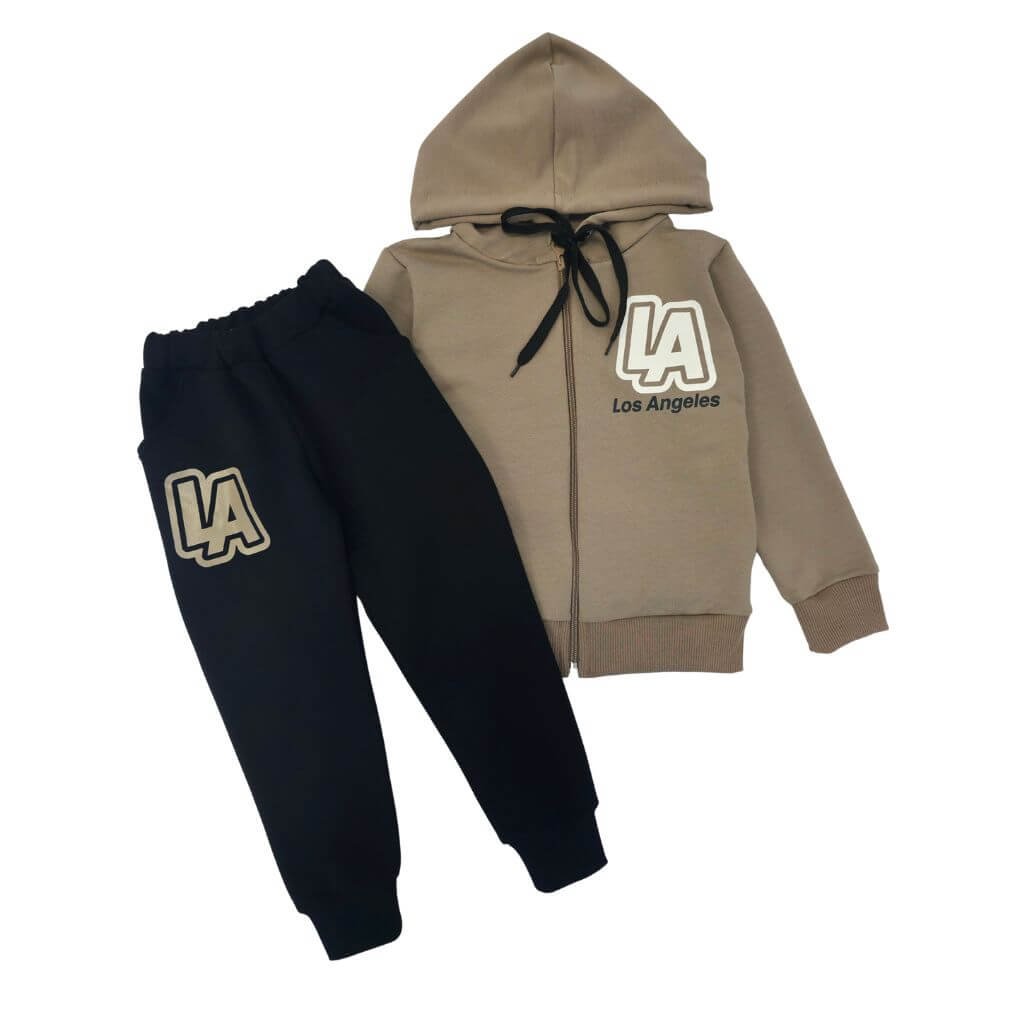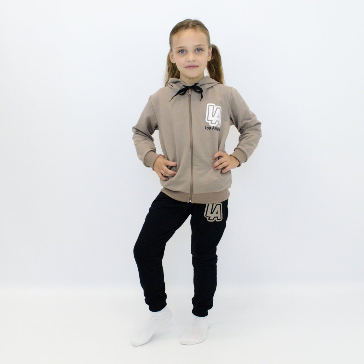 Интернет-магазин "Арлекин" хочет обрадовать Вас своей невероятной и стильной новинкой. Детский спортивный костюм состоит из кофты бежевого цвета и штанишек черного цвета. Представленные изделия изготовлены из высококачественного трикотажного полотна - двухнитки. Данная ткань полностью состоит из натурального хлопка, поэтому полотно абсолютно безопасное для кожи ребёнка. В таком спортивном костюме вашему ребёнку будет максимально комфортно. Кофта дополнена уютным капюшоном. На штанах присутствуют кармашки. Также представленный костюм дополнен стильными надписями LA, которые точно понравятся Вашему ребёночку.