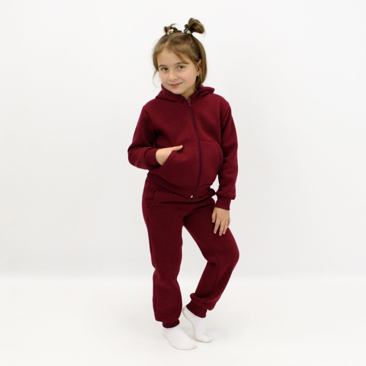 Спортивный детский костюм состоит из кофты с капюшоном и штанишек. Изделия изготовлены из мягкого качественного трикотажного полотна - трехнитки. Данная ткань обеспечивает хорошую воздухопроницаемость и комфорт, что делает его идеальным вариантом как для спортивных занятий, так и для повседневного ношения. Кофта с капюшоном выполнена на молнии и дополнена небольшими кармашками. На поясе штанишек присутствует мягкая эластичная резинка. Данный спортивный костюм представлен в цвете бордо, идеальный вариант как для мальчика, так и для девочки.