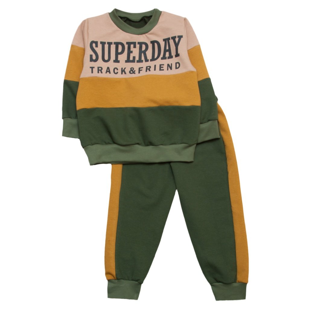 Предлагаем Вашему вниманию невероятную новинку нашего интернет-магазина - спортивный костюм для мальчика. Модный комплект изготовлен из качественного полотна двухнитка и комбинирован тремя цветами а именно ( кремовый, горчичный, зеленый) который очень понравится вашему защитнику. Полотно довольно плотное, для спортивных костюмов подходит идеально, в носке не вытягиваются и не затираются коленки и локотки. Дизайн костюма интересный но в то же время довольно простой. На рукавах, по низу кофты, и по низу штанишек манжеты из стрейчевого полотна. Кофта комбинирована тремя цветами, а в штанишках горчичная вставка, благодаря которой очень гармонично дополняют друг друга.