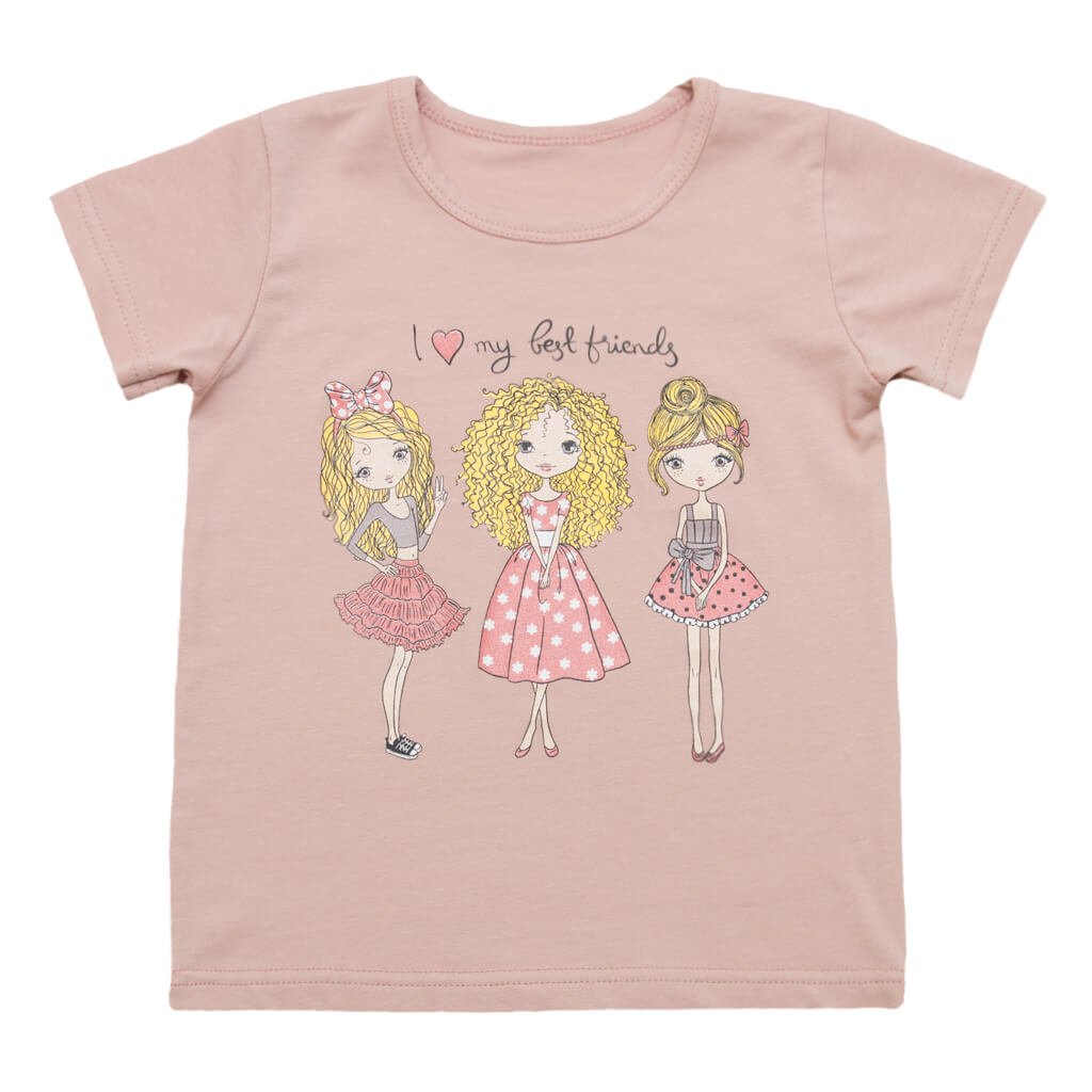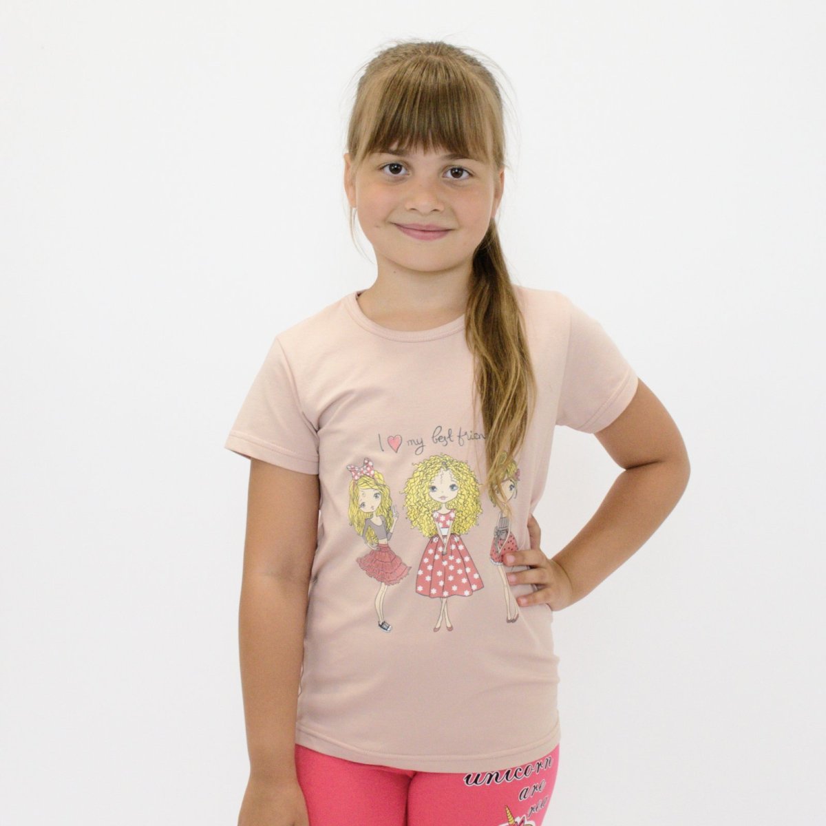 В нашем интернет-магазине стильная новинка - замечательная детская футболка. Модель изготовлена из натурального полотна - фуликра. Полотно мягкое и приятное к телу, не вызывает аллергии. Футболочка представленная нежного бежевого цвета. Полотно не теряет форму и цвет, после многочисленных стирок. Горловина на футболке обработана бейкой, рукава и низ футболки обработаны распошивом.; Благодаря правильному крою, футболка не будет сковывать движение юной моднице.По переду футболки стильная и качественная покраска девочек. Приобретайте такую футболочку и Ваш ребенок будет носить ее с удовольствием. Приятных Вам покупок и хорошего настроения!