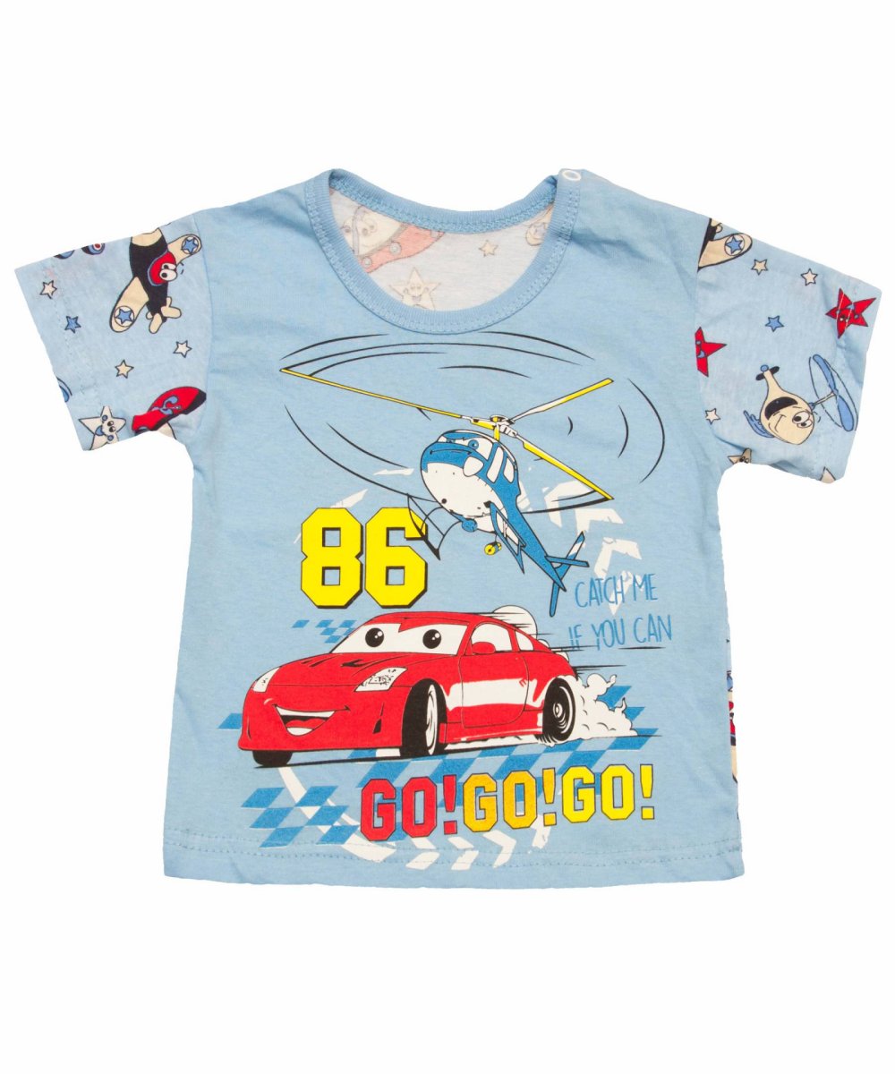 Футболки самый простой и привычный элемент гардероба любого ребенка в летний период. Но футболка футболке рознь. Мы предлагаем Вам не просто детскую футболку, а футболку для самых маленьких. Модель представлена в 3-х размерах 48, 52, 56. Именно поэтому для удобства одевания и снятия, на футболке есть 2 кнопки в районе плечика, что облегчит это процесс как минимум на 50%. Футболка комбинированная: однотонный перед сочетается с набивными рукавами и спинкой. Межу собой их объединяет шикарная покраска по переду в виде героев мультфильма тачки, которая гармонично и тематически сочетается с расцветкой полотна. Полотно из которого и сшита эта модель - кулр, хорошо подойдет для лета.