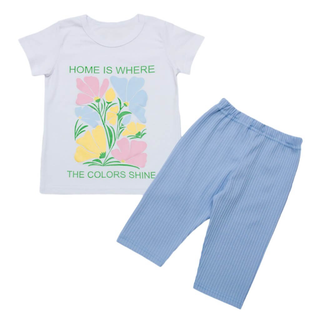 Летний гардероб маленькой модницы невозможно представить без стильного и удобного комплекта. Новая модель детского комплекта состоит из футболочки белого цвета и тресс голубого цвета. Футболка пошита из качественного эластичного полотна - стрейч-кулир, а трессы из материала мустанг. Такое сочетание точно гарантирует комфорт во время носки. Футболочка украшена красивым принтом цветов на передней стороне. А однотонные трессы отлично сочетаются с рисунком на футболке. Благодаря универсальному дизайну, этот комплект легко комбинируется с другими элементами гардероба.