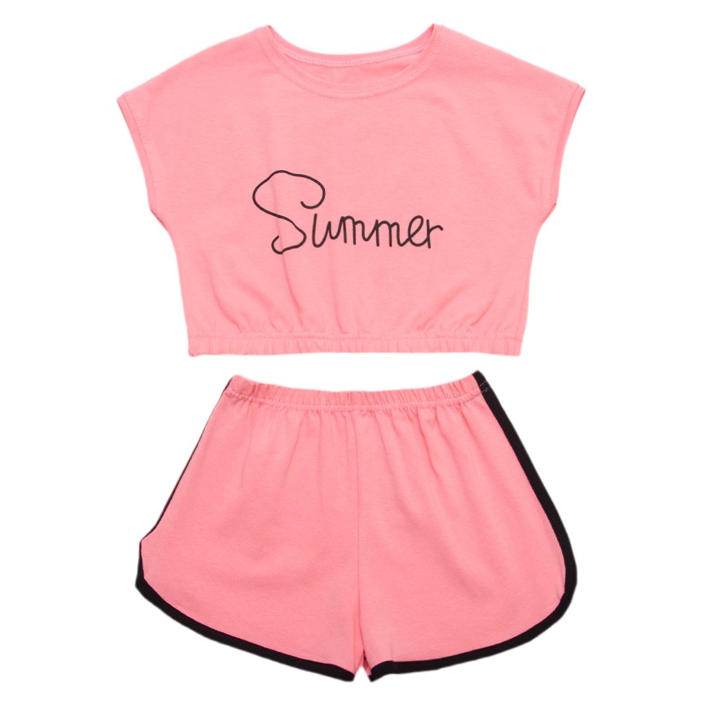 Стильная новинка нашего интернет-магазина "Арлекин", которая точно понравится маленьким модницам. Представленный комплект для девочки состоит из футболки и шорт персикового цвета. Изделия пошиты из высококачественного трикотажного полотна - стрейч-кулира. Такой материал обладает хорошей эластичностью, благодаря чему, комплект обеспечит комфорт и полную свободу движений. Укороченная футболочка дополнена стильной надписью, а по низу изделия присутствует резинка. Детский комплект футболки и шортов идеально подходит для игр на открытом воздухе, прогулок, пикников и других активностей.