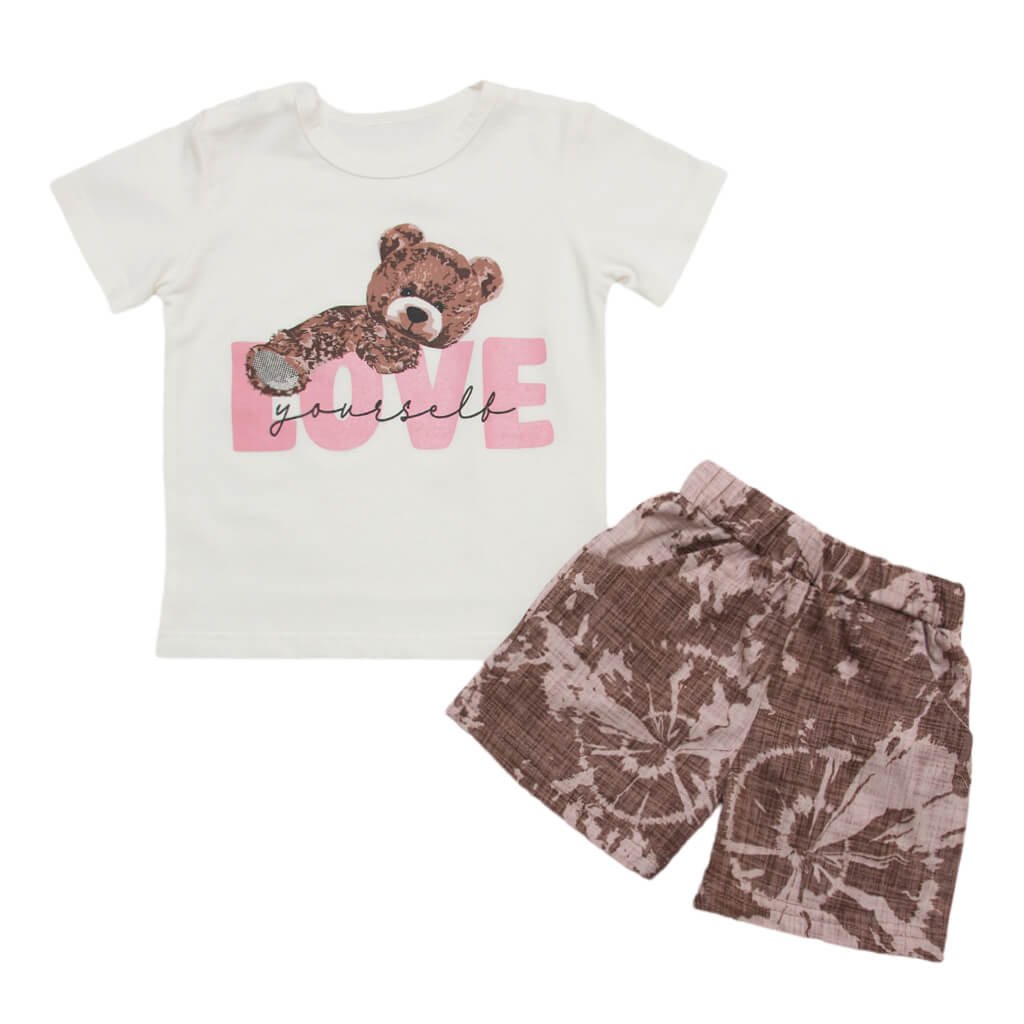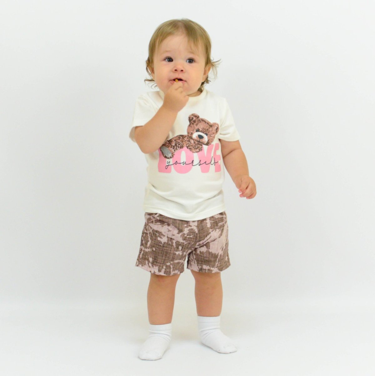 Комплект для девочки на лето должен быть лёгкий, не паркий и комфортный в носке. Именно такими качествами владеет данная модель детского комплекта. Футболка молочного цвета с кнопкой на плече, что удобно при одевании, изготовлена из качественного стрейч-кулира - ткань эластичная, достаточно плотная и хорошо держит форму. Короткие детские шорты коричневого цвета с карманами из ткани кулир, на 100% хлопковые, на широкой резинке, свободные по крою. Футболка с принтом мишки, который точно понравится малютке! На лето комплектов много не бывает, поэтому рекомендуем не останавливаться только на одном. Летний комплект от украинского производителя ТМ Арлекин - это лучший выбор!