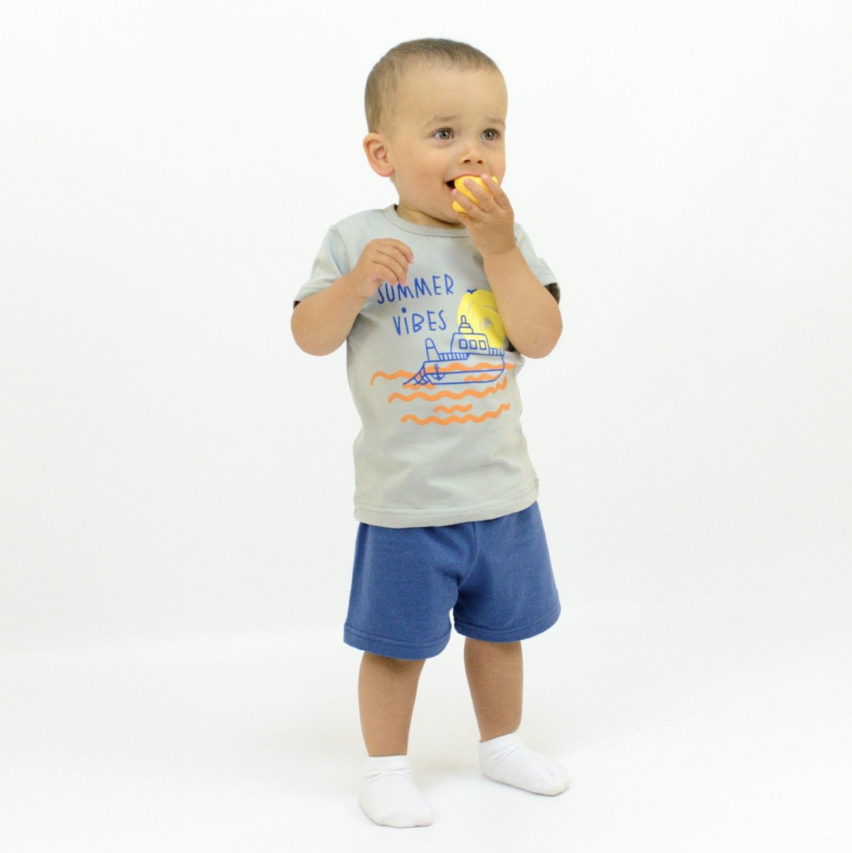 Долгие летние прогулки приятны и деткам, и родителям. Когда ребенку удобно и не жарко, нет поводов для капризов. Комплект для малышей из натуральной ткани будет незаменим в такую пору. Полотно неприхотливо в уходе и не теряет форму после многочисленных стирок. Темные шорты цвета индиго и красочная серая футболка с такими любимым корабликом порадуют своим качеством маму, и придутся по вкусу маленькому моднику. Для удобства при переодевании на горловине есть кнопочки. Шортики на резиночке. Делайте покупки с радостью вместе с ТМ Арлекин.