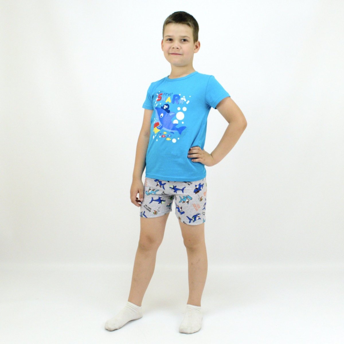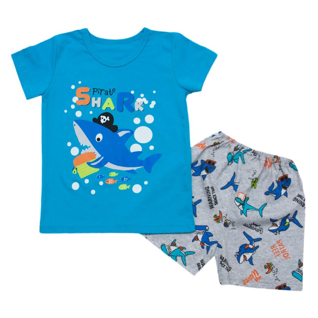 Идеальный вариант на тёплое время года для Вашего мальчишки - трикотажный комплект футболочки и шортиков бирюзового цвета. Наша новая модель детского комплекта изготовлена из мягкого и дышащего полотна - кулира, который обеспечит ощущение невероятной легкости на теле вашего ребенка. Футболка украшена яркой и красочной покраской акулы, которая идеально сочетается с принтом на шортиках. Шорты выполнены на мягкой резинке, которая хорошо зафиксирует изделие. Такой комплект отлично подойдёт для повседневной носки, и также в качестве пижамы.