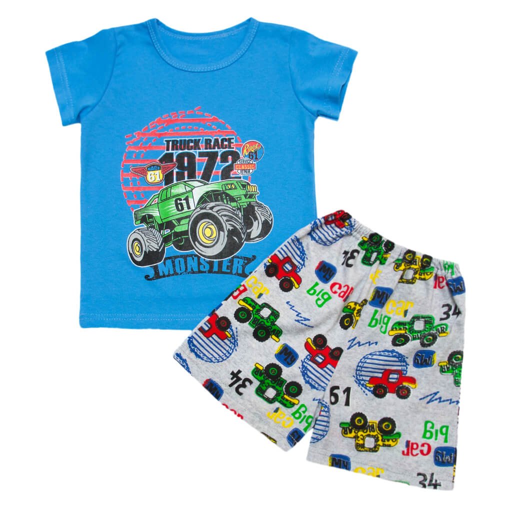 Идеальный вариант на тёплое время года для Вашего мальчишки - трикотажный комплект футболочки и шортиков голубого цвета. Наша новая модель детского комплекта изготовлена из мягкого и дышащего полотна - кулира, который обеспечит ощущение невероятной легкости на теле вашего ребенка. Футболка украшена яркой и красочной покраской машины, которая идеально сочетается с принтом на шортиках. Шорты выполнены на мягкой резинке, которая хорошо зафиксирует изделие. Такой комплект отлично подойдёт для повседневной носки, и также в качестве пижамы.