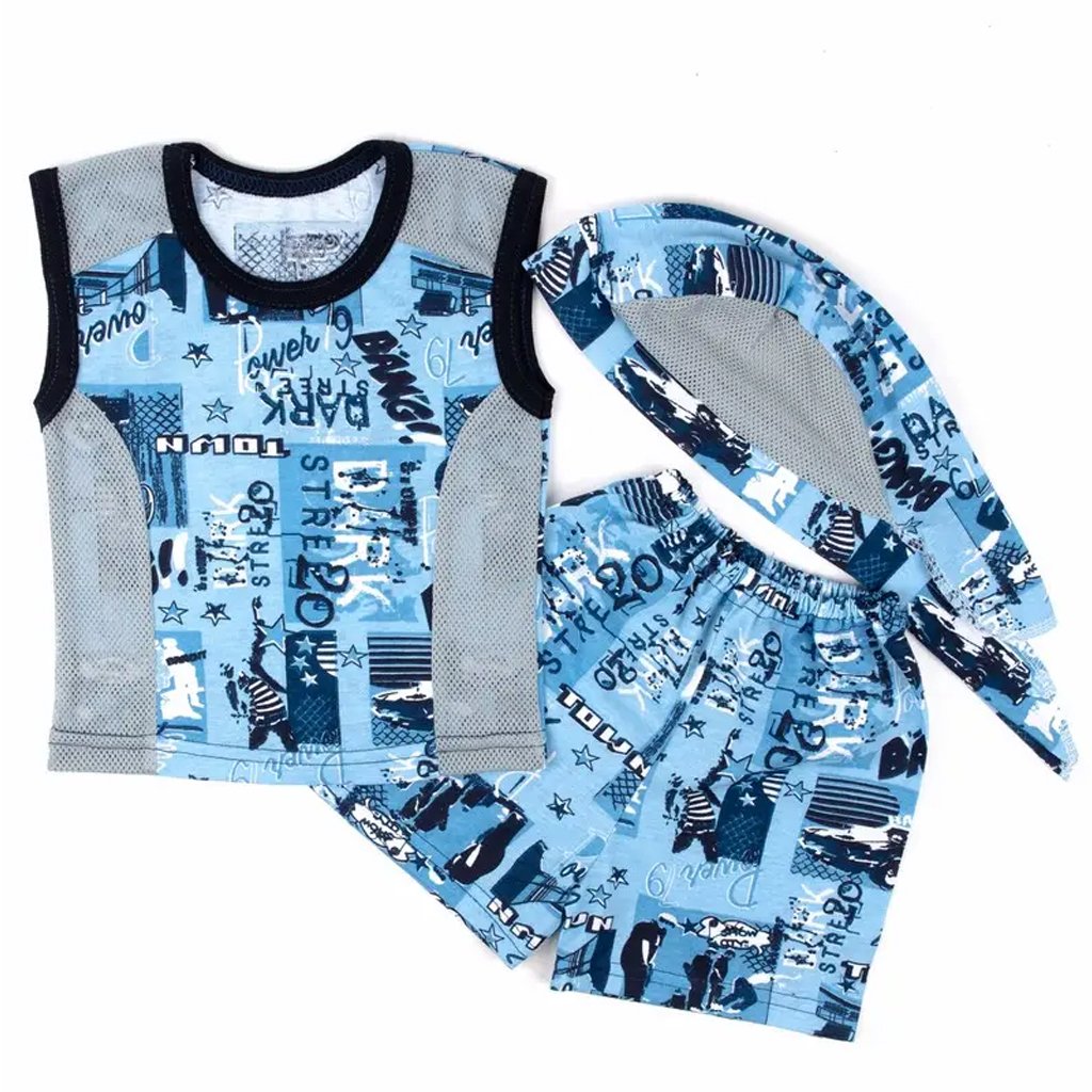 Детские комплекты на лето - отличный и удобный вариант для жаркой погоды. Представленный комплект пошит из качественного хлопчатобумажного кулира в голубой расцветке. В представленный комплект входит майка безрукавка, шортики и бандана. На майке и бандане присутствуют вставки из сеточной ткани благодаря которым кожа малыша сможет свободно дышать. Такой яркий и стильный комплект станет незаменимым в гардеробе Вашего малыша. В нашем интернет-магазине «Арлекин» Вы сможете найти качественную детскую одежду по доступной цене!