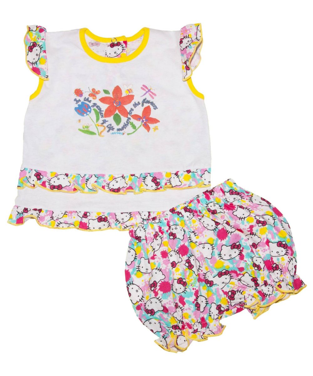 В комплекте «Солнышко» от ТМ «Арлекин», ваша малышка дочурка будет выглядеть модно и ярко. Комплект состоит из коротенького платьица-тунички и трусиков под памперс. Платьице комбинировано кулирным полотном однотонным – передняя полочка и цветным – спинка, рукавчик и рюшки, а так же трусики под памперс. По низу переда тунички, на небольшом расстоянии друг от друга, пришиты рюшки, низ которых обработан цветной опиковкой. Маленький рукавчик-крылышко придаёт легкости и воздушности платьицу. Горловина обработана однотонной бейкой. На передней полочке набита яркая и красочная термотрансферная наклейка. Трусики свободного покроя, поэтому их можно одевать на памперс. Ножки трусиков обработаны пике.