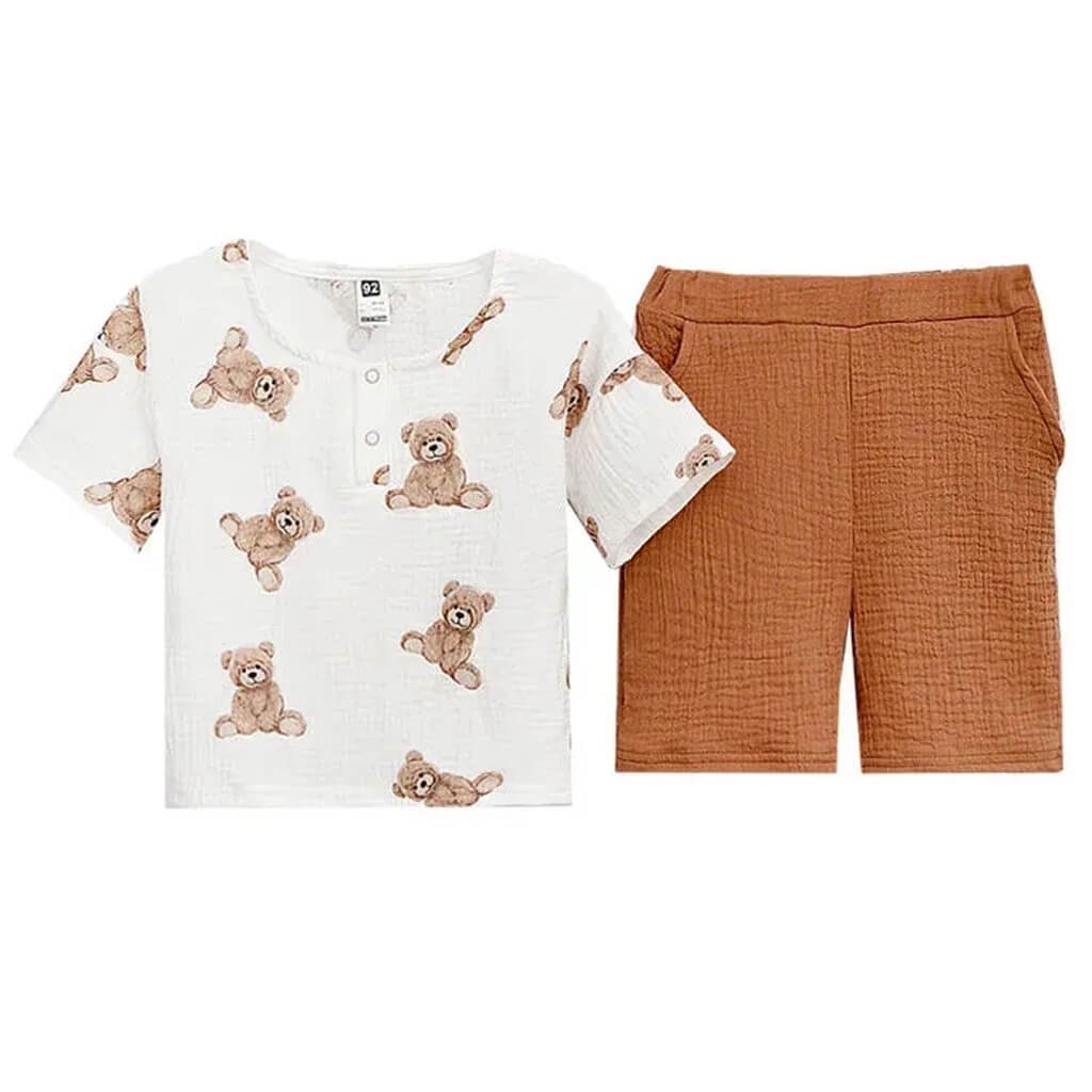 Этот комплект - настоящая находка для летнего гардероба малыша. Он создан из мягкого и дышащего муслина, который дарит коже ощущение легкости и свежести даже в самые солнечные дни. Полотно муслин популярен своей натуральностью и способностью отлично пропускать воздух, что делает его идеальным вариантом для активных детей, которые не сидят на месте ни минуты. Футболка молочного цвета украшена милым принтом мишек, а свободный крой не сковывает движений, а аккуратная застёжка делает процесс одевания максимально простым и удобным. Шорты в комплекте - однотонные коричневого цвета, на мягкой эластичной резинке, что обеспечивает комфортную посадку и не давит на животик.