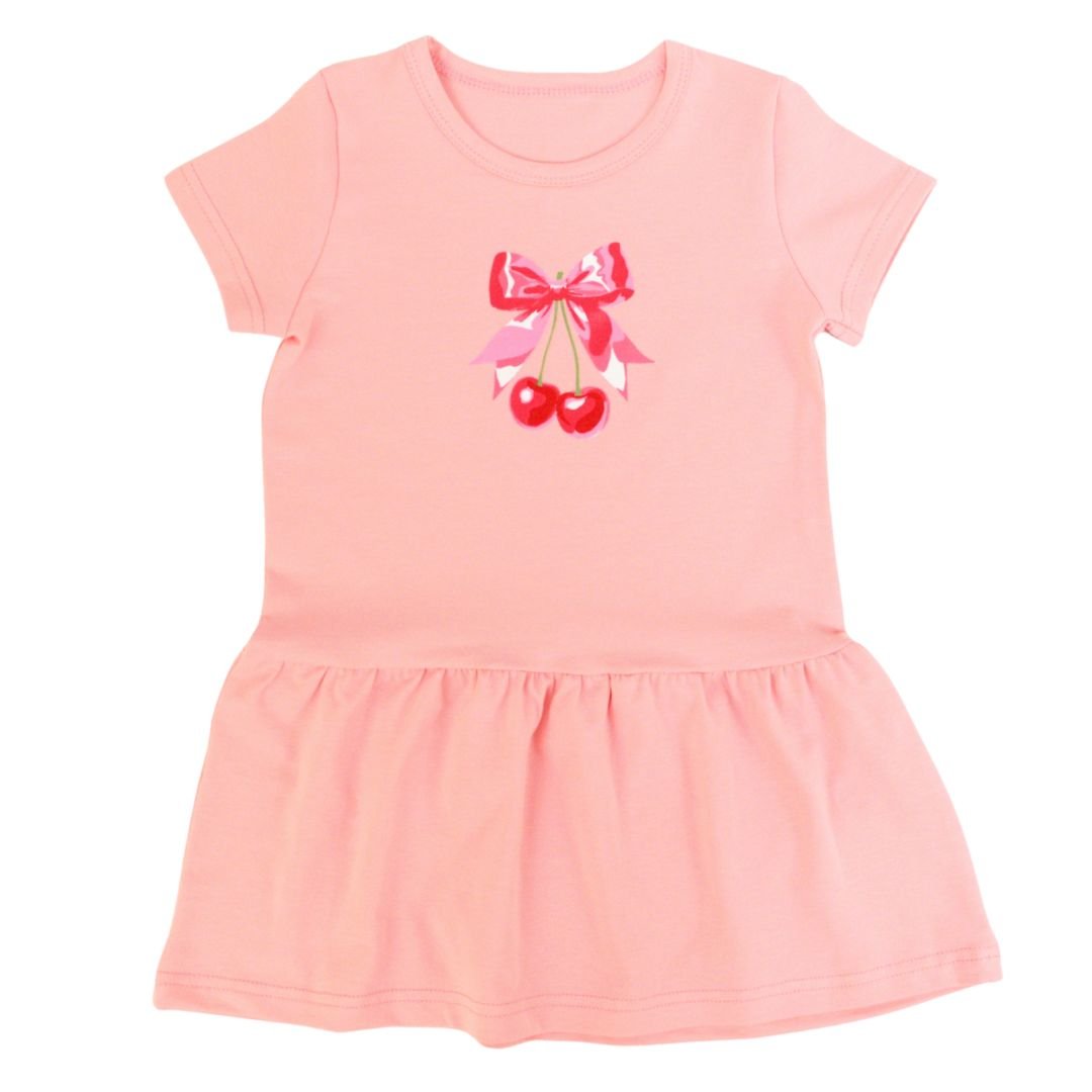 Милое платье для девочки пошито из высококачественного трикотажного полотна - стрейч-кулира персикового цвета. Такая ткань имеет в своём составе небольшой процент эластана, благодаря которому изделия хорошо тянутся и при этом сохраняют свою первоначальную форму. Стрейч-кулир выполнен из тонкой хлопковой нити, по этому полотно невероятно мягкое и приятное на ощупь. В таком платьице Ваша маленькая принцесса будет чувствовать себя легко и комфортно. Украшает данную модель платья красивая и яркая покраска вишни, которая расположена на лицевой стороне изделия.