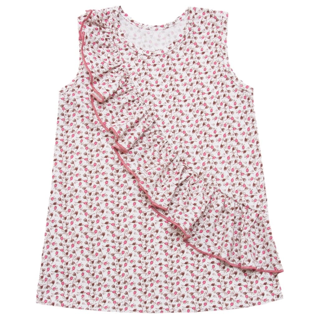 Платье для девочки пошита из мягкого, приятного к телу полотна кулир-пенье молочного цвета, мелкими тюльпанами. Полотно натуральное, полностью из хлопка, что очень важно на летний период времени. Интересный дизайн не оставит Вас равнодушным. По переду от плеча и до самого низа есть рюша, которая пришита по диагонали. Проймы и горловина обработаны бейкой из такого же полотна. Низ платья обработан распошивом. Приобретайте такое платье и порадуйте свою принцессу красивой обновкой. Хорошего настроения вместе с торговой маркой "Арлекин".
