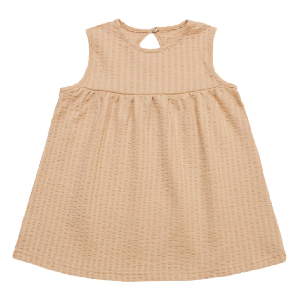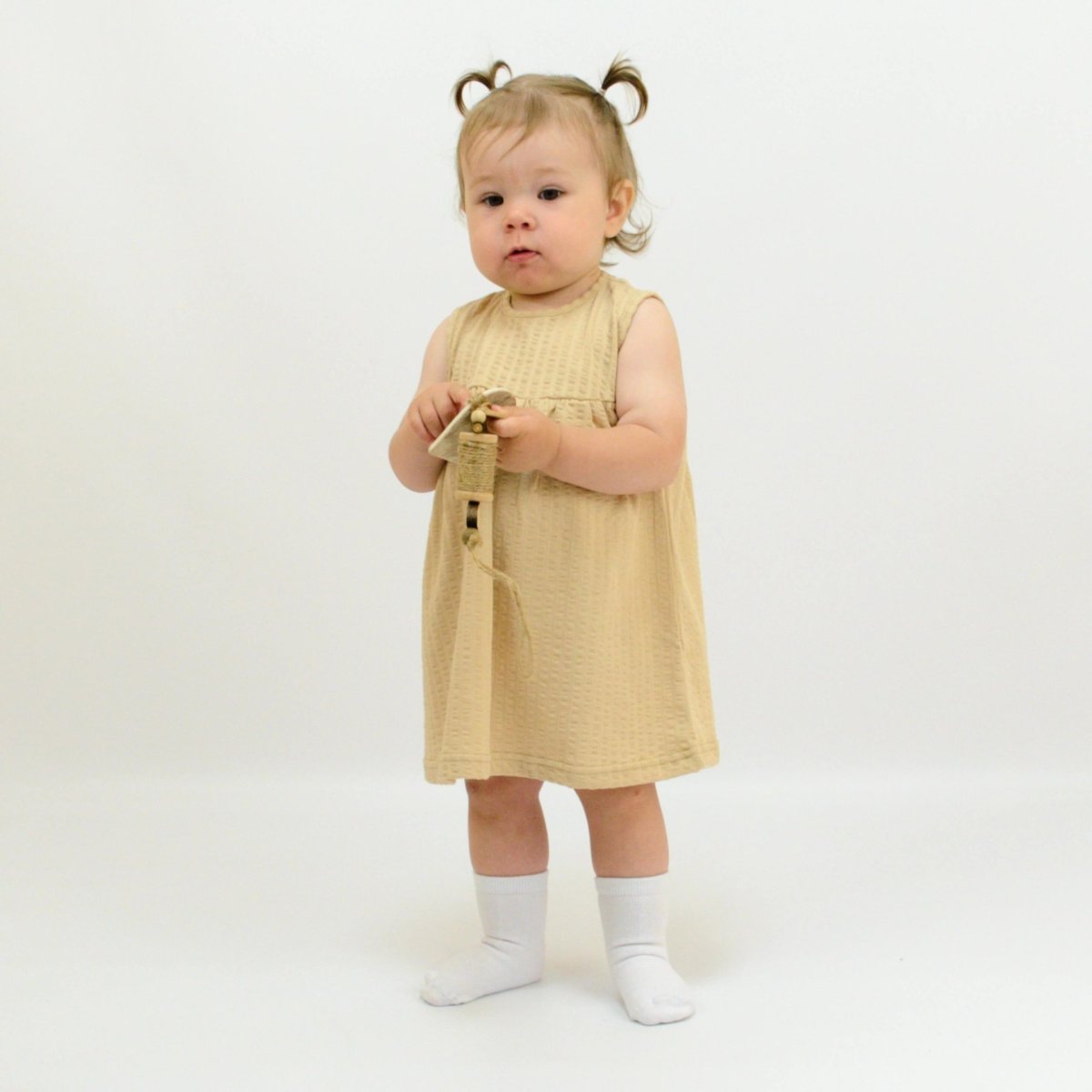 Когда хочется лёгкости и уюта даже в самые жаркие дни, на помощь приходит этот очаровательный сарафан бежевого цвета. Выполненный из качественного полотна интерлок жаккард, оно отличается мягкостью, отличной воздухопроницаемостью и устойчивостью к деформации, что особенно важно в активной повседневной жизни ребёнка. Верхняя часть сарафана выполнена в форме классической майки - без рукавов, с аккуратной горловиной. Юбка - свободного кроя, лёгкая и воздушная. Такой фасон особенно удобен для прогулок и игр на свежем воздухе. Застёжка на кнопке, расположенная сзади, делает процесс переодевания быстрым и удобным, не доставляя малышу дискомфорта.