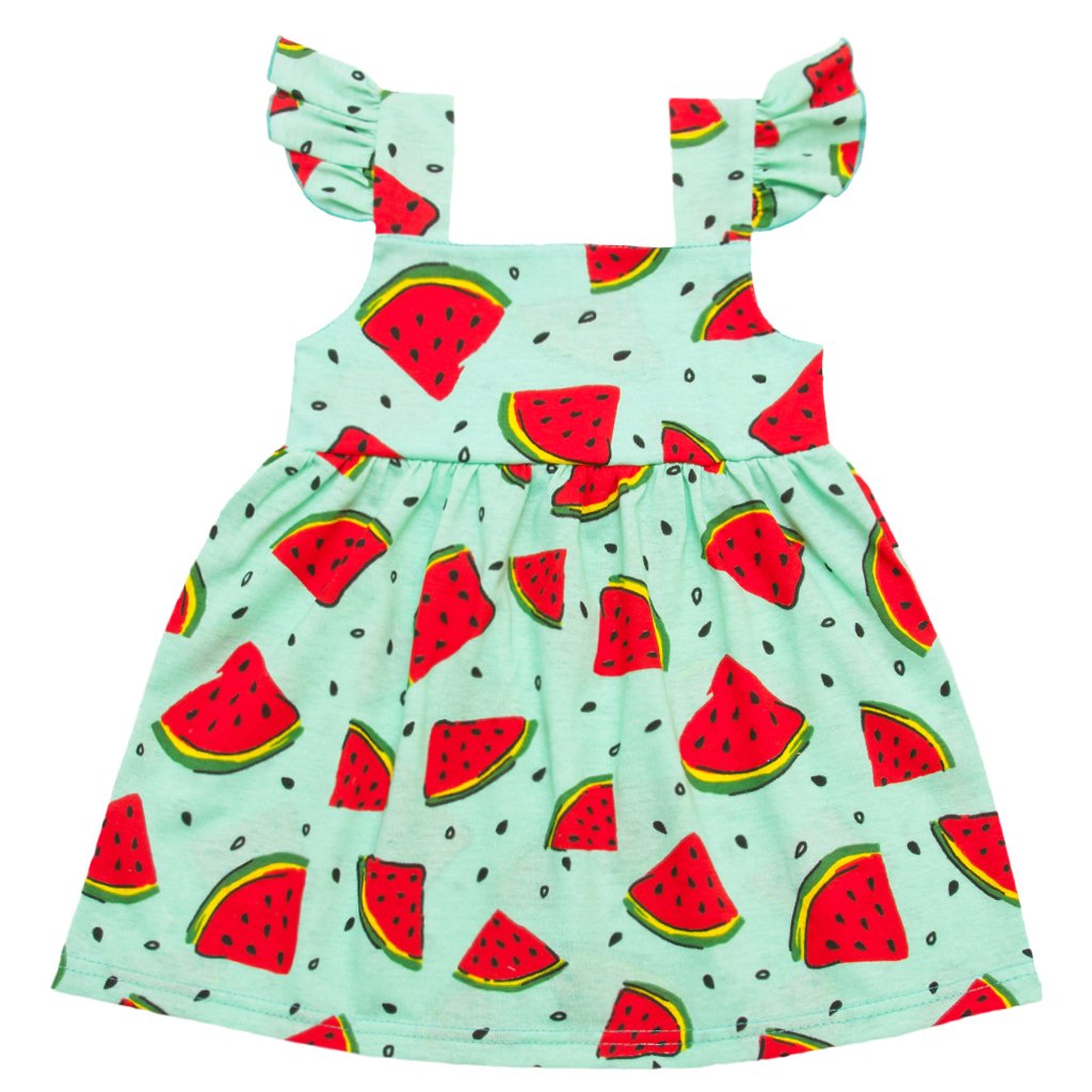 Летний сарафанчик, мятного цвета принт арбузики, обязательно должен быть в гардеробе каждой маленькой модницы. Данная модель сарафана для девочки пошита из качественного и гипоаллергенного кулира, данная ткань мягкая и на ощупь очень приятная. Благодаря такому полотну, сарафанчик выглядит очень легким и воздушным. Бретельки сарафана украшают небольшие крылышки. Сзади присутствуют небольшие кнопочки, при помощи который сарафан можно легко надеть. Расцветка сарафана невероятно красивая и яркая. Ваша маленькая принцесса точно останется довольна такой обновочкой.