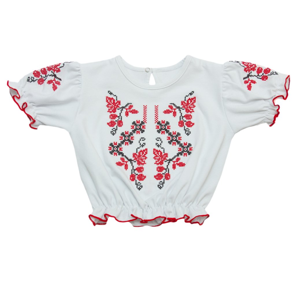 Блузочка-вышиванка с коротким рукавчиком для девочек, из белого полотна стрейч-кулир. Хорошо подходит для теплого весенне-летнего сезона. Отлично впишется в гардероб девчушек от одного до девяти лет. На рукавах и по низу блузочки пришита тоненькая резиночка-ниточка, для придания воздушности изделию. На передней полочке и на рукавах цветная вышивка с украинским орнаментом. Горловинка обработана руликом, который сзади переходит в застежку-капельку на пуговичке. Низ рукавчиков и низ вышиванки украшены опиковочной строчкой с цветной ниткой.