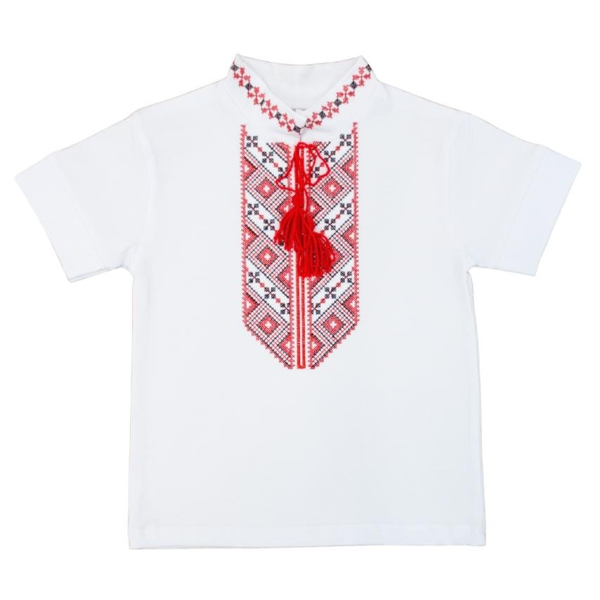 Трудно представить современного ребёнка без стильной и качественной вышиванки в гардеробе. На нашем сайте "Арлекин" Вы сможете подобрать идеальную вышиванку для своего малыша. Данная модель выполнена из высококачественного полотна белого цвета - стрейч-кулира. Ткань очень приятная и мягкая на ощупь, что подарит Вашему карапузу максимальное чувство комфорта. Воротник изделия выполнен небольшой стоечкой. Вышиванка с коротким рукавом, и благодаря этому станет отличным выбором на тёплое время года. Сама вышивка красного орнамента расположена на груди и на воротнике.