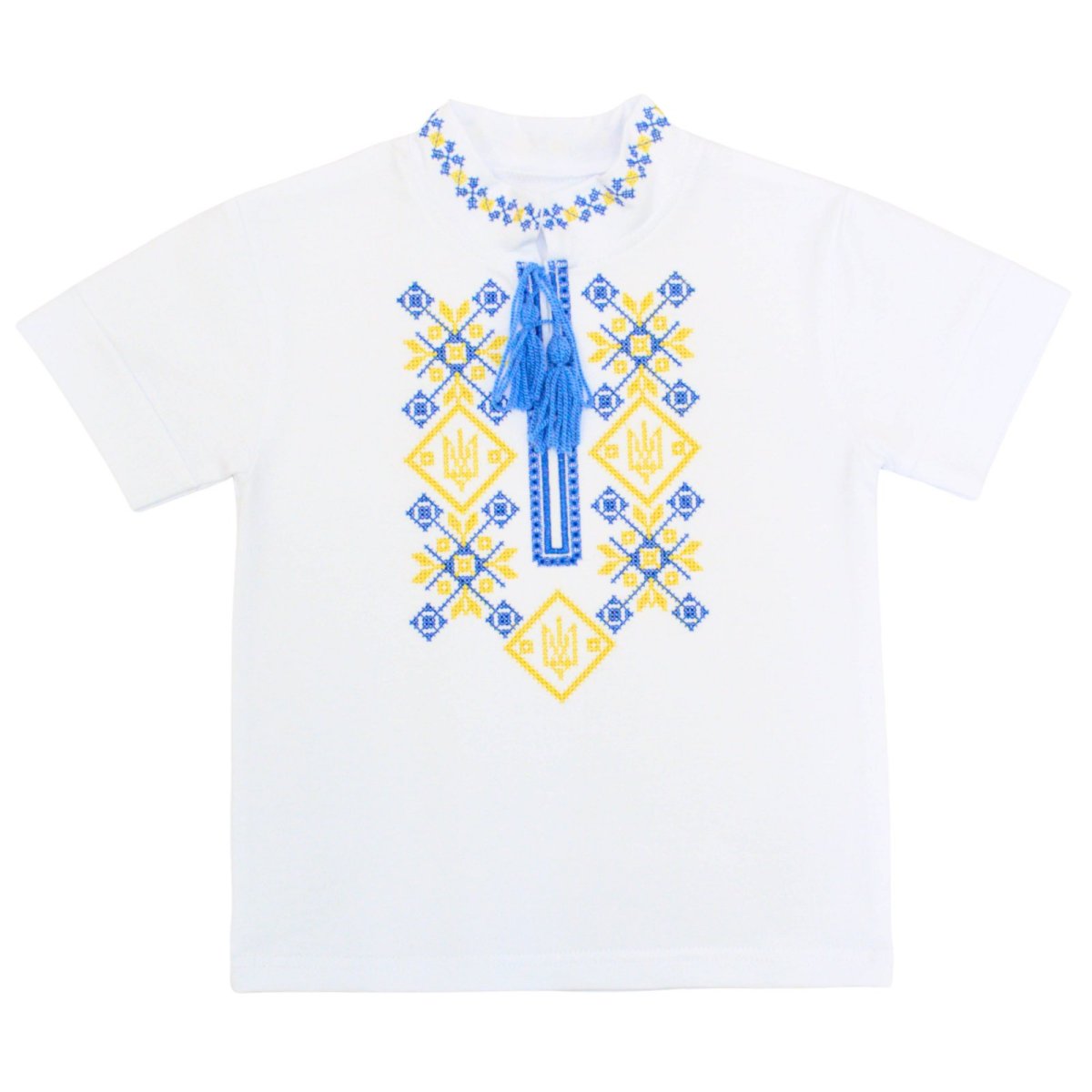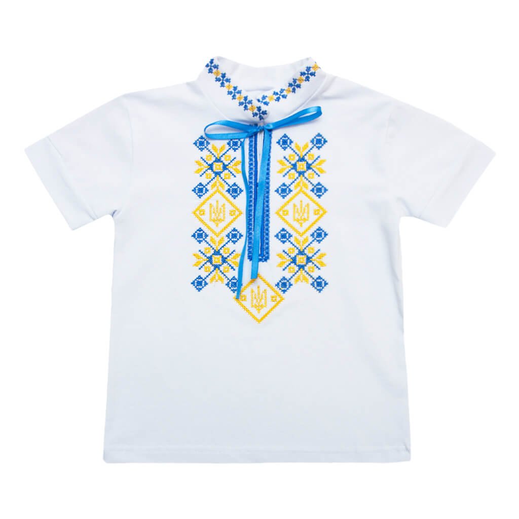 Трудно представить современного ребёнка без стильной и качественной вышиванки в гардеробе. На нашем сайте "Арлекин" Вы сможете подобрать идеальную вышиванку для своего малыша. Данная модель выполнена из высококачественного полотна белого цвета - стрейч-кулира. Ткань очень приятная и мягкая на ощупь, что подарит Вашему карапузу максимальное чувство комфорта. Воротник изделия выполнен небольшой стоечкой. Вышиванка с коротким рукавом, и благодаря этому станет отличным выбором на тёплое время года. Сама вышивка желтого тризуба расположена на груди и на воротнике.