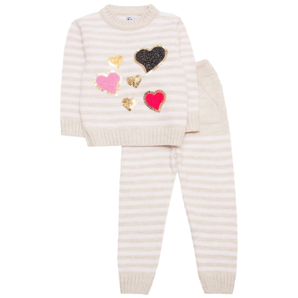Сейчас на пике популярности вязаные костюмы. Теперь не только взрослые могут их носить, но и дети. Посмотрите, какую мы приготовили для Вас новинку! Вязаный костюм для девочки, который выполнен из мягкой теплой вязки. В состав нити входит акрил и шерсть. Комплект выполнен в полоску, что делает его необычным и особенным. Впереди кофточки очень красивый декор — сердечки из паеток. Ох, как все девочки любят их. Поспешите приобрести этот комплект своей девочке в нужном размере. Она точно обрадуется такой обновке.