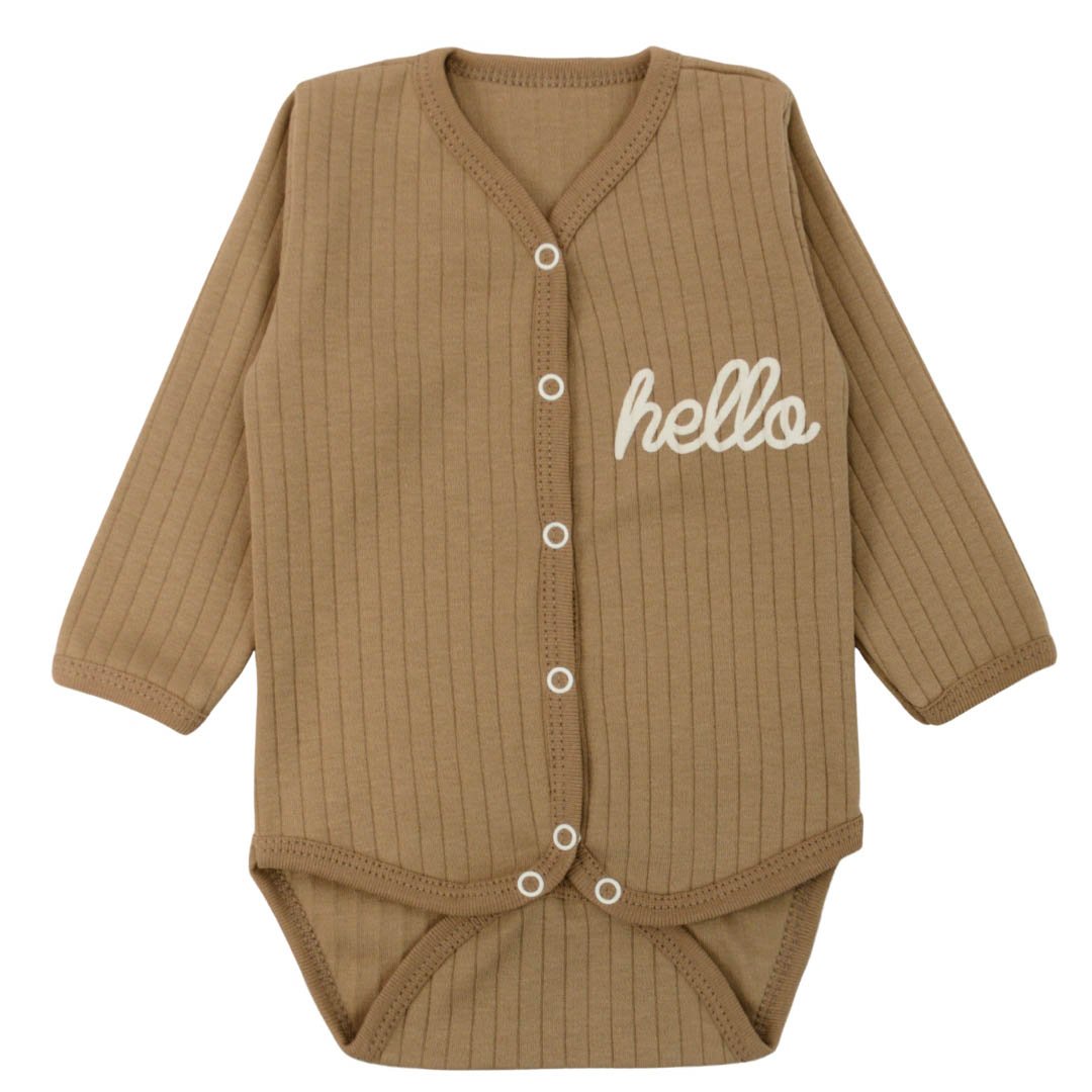 Когда хочется, чтобы малыш выглядел аккуратно, а переодевание занимало пару секунд - на помощь приходит удобный боди коричневого цвета с надписью Hello с застёжкой спереди. Эта модель создана для ежедневной носки: она комфортная, практичная и отлично подходит как для дома, так и для прогулок. Боди выполнен из полотна интерлок рапорт: ткань мягкая, приятная к телу, хорошо тянется и при этом остаётся достаточно плотной, чтобы сохранять форму. Кнопочки расположены спереди, поэтому боди легко надевать даже самым маленьким. Боди представлен в нескольких расцветках, поэтому можно выбрать любимый оттенок или собрать несколько вариантов на смену.