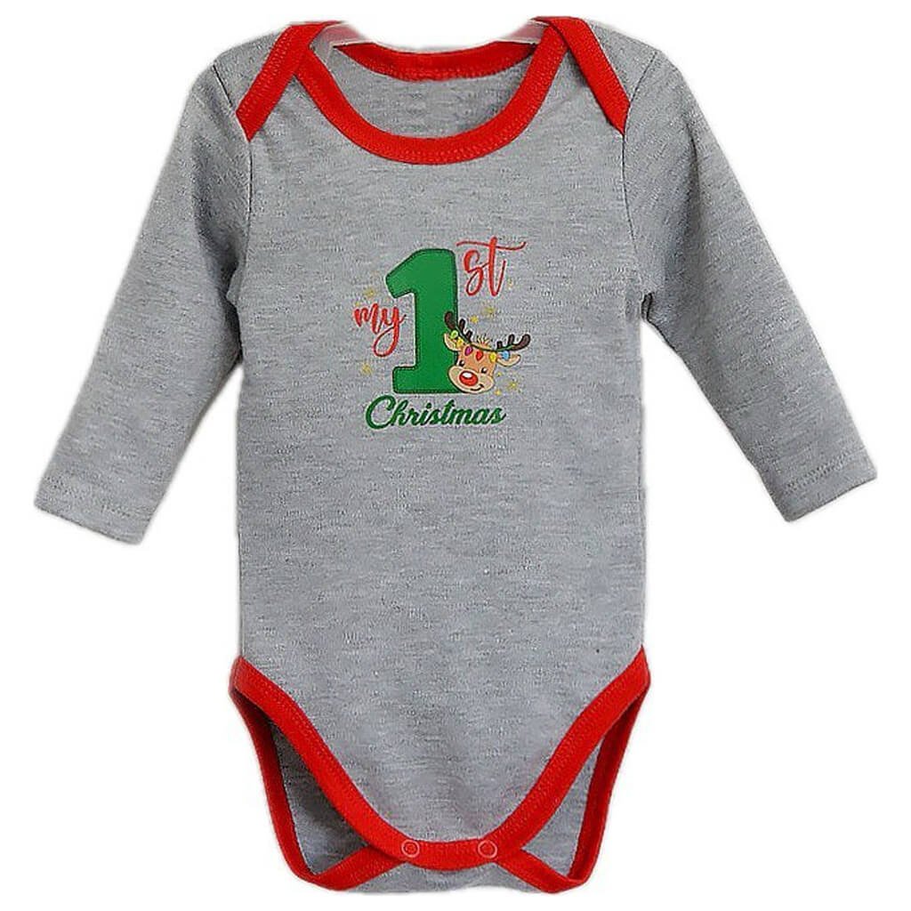 Детский боди из мягкого полотна интерлок серого цвета - это уют и стиль в одном изделии, которое подарит Вашему малышу комфорт и праздничное настроение. Дизайн боди выполнен в новогоднем стиле и украшен ярким принтом в виде надписи Мое первое Рождество на передней стороне. Этот праздничный элемент делает боди отличным выбором для зимних дней и семейных праздников. Горловина «лодочка» обеспечивает удобство при одевании и позволяет легко снимать боди, не создавая дискомфорта для малыша. Внизу изделия есть удобные кнопочки, которые позволяют быстро и легко менять подгузник. Края представленного боди обработаны бейкой.