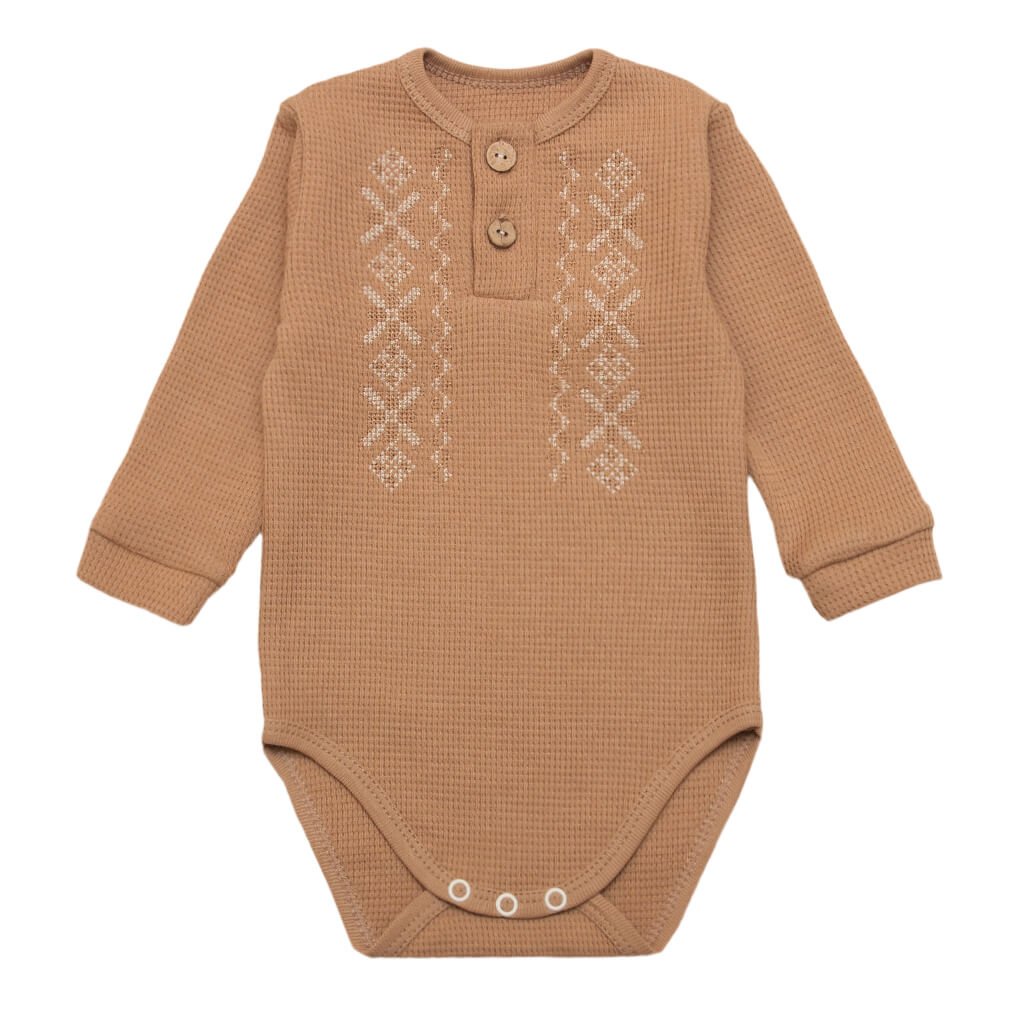Мягкость и уют в каждой детали - именно так можно описать этот очаровательный боди для малышей. Он выполнен из приятного к телу полотна интерлок вафелька бежевого цвета, которое отлично сохраняет тепло, не раздражая нежную кожу ребёнка. На груди расположена изящная вышивка орнамента в этническом стиле, добавляющая изделию особую нарядность. Две аккуратные пуговицы спереди не только украшают, но и упрощают процесс переодевания. А застёжки-кнопки в нижней части обеспечивают лёгкий доступ при смене подгузника. Такой боди станет прекрасным выбором как для повседневной носки, так и для особых случаев - например, крестин.