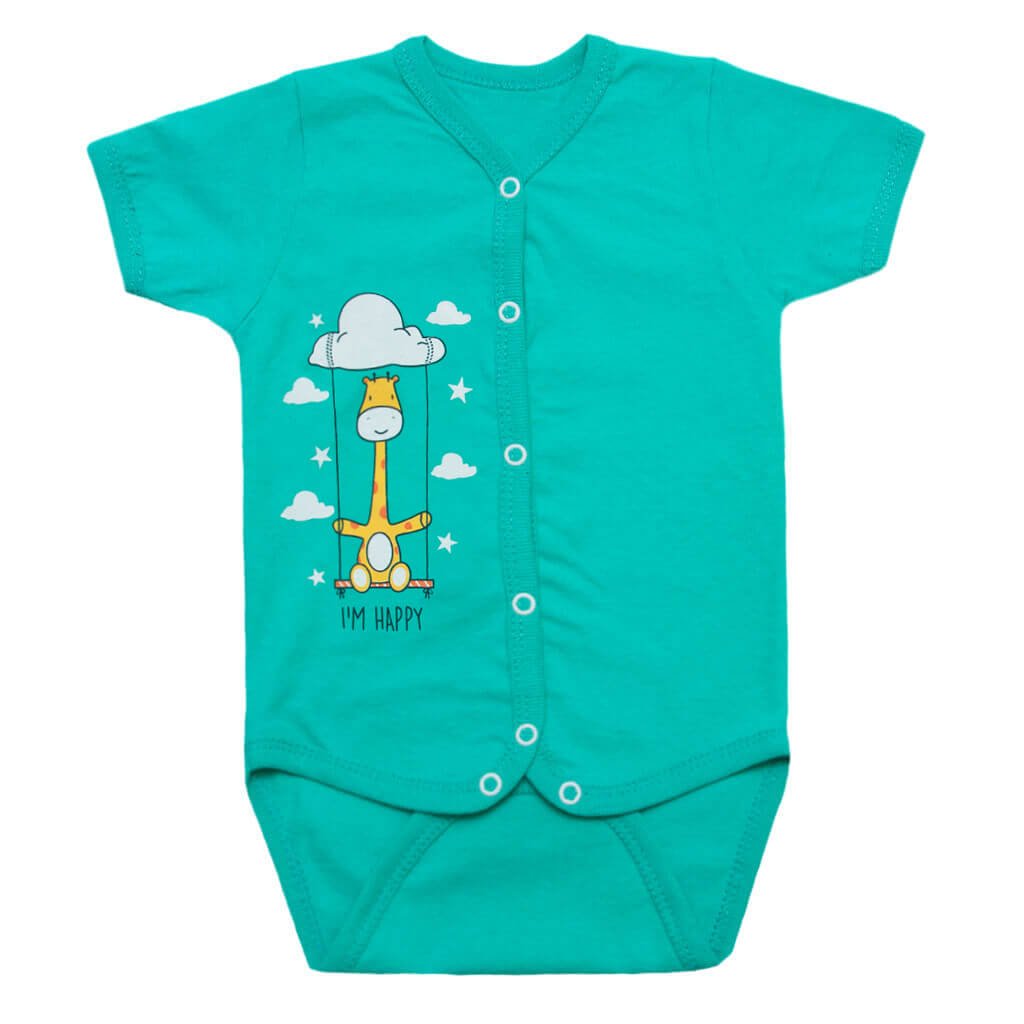 Боди детский мятного цвета - летний, легкий, дышащий, удобный и красивый - вот, что нужно Вам и Вашему малышу. Боди на кнопочке, по этому Ваш малыш будет себя чувствовать удобно и комфортно. Ножки и ручки натирать не будет, ведь края обработаны беечным полотном. По переду красивая и милая покраска жирафа, которая не оставит без внимания ни одного малыша. Наша торговая марка заботится о качестве своей продукции, чтобы Ваш ребеночек себя чувствовал в ней комфортно. Порадуйте себя и малыша обновочками!