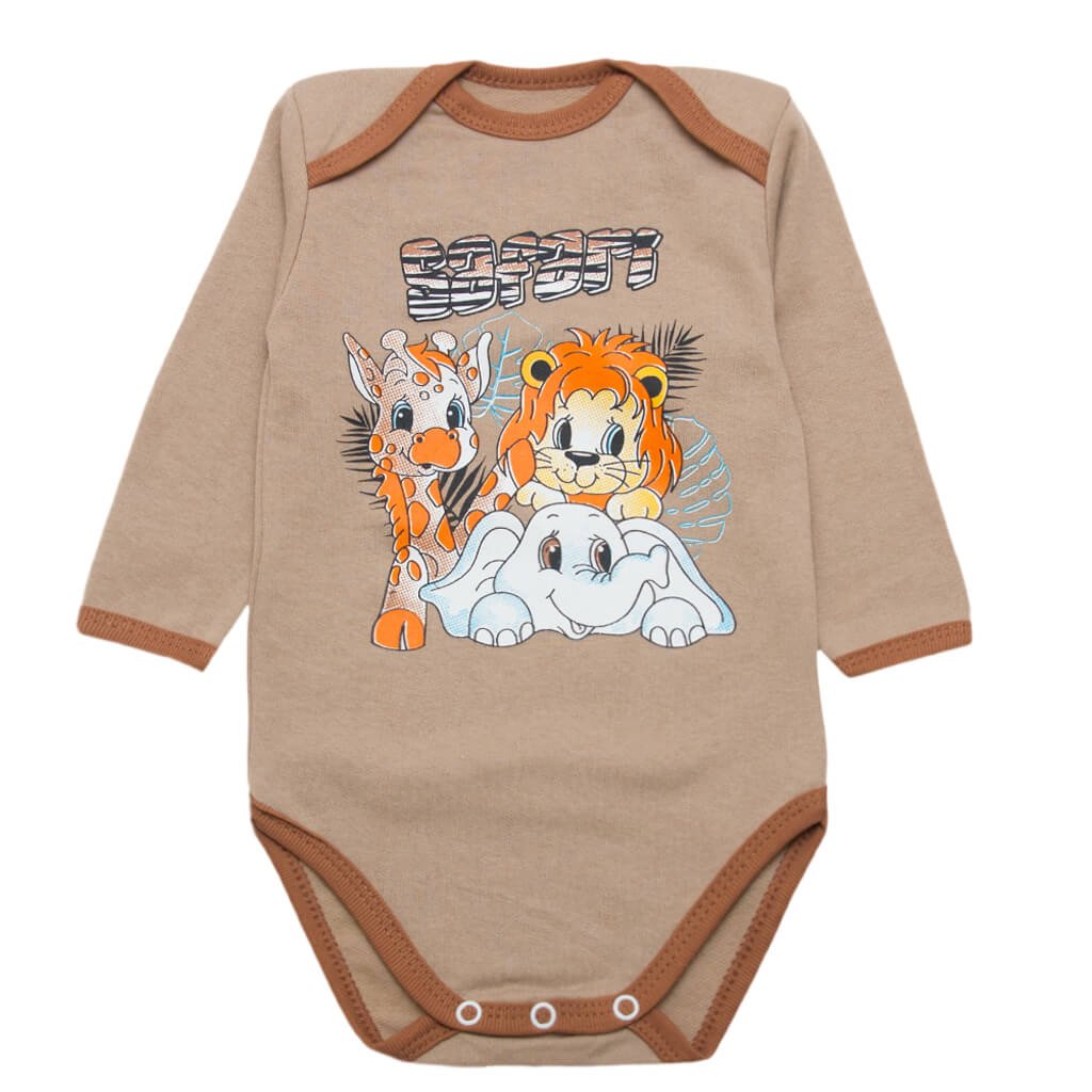 Бодик детский, бежевого цвета, принт сафари, пошит из натурального хлопчатобумажного начесного полотна. Изделия из такого полотна пользуются большим спросом для малышей, так как обладает многими положительными качествами. Полотно теплое, в то же время очень мягкое и приятное к нежной коже малыша. Не привередливо в уходе, и не кошлатится. Горловина на этом бодике сделана лодочкой, а по низу есть кнопочки. Рукавчики и горловинка, а также низ боди обработаны бейкой. А украшает бодик очень красивая и веселая тематическая покраска по переду изделия.