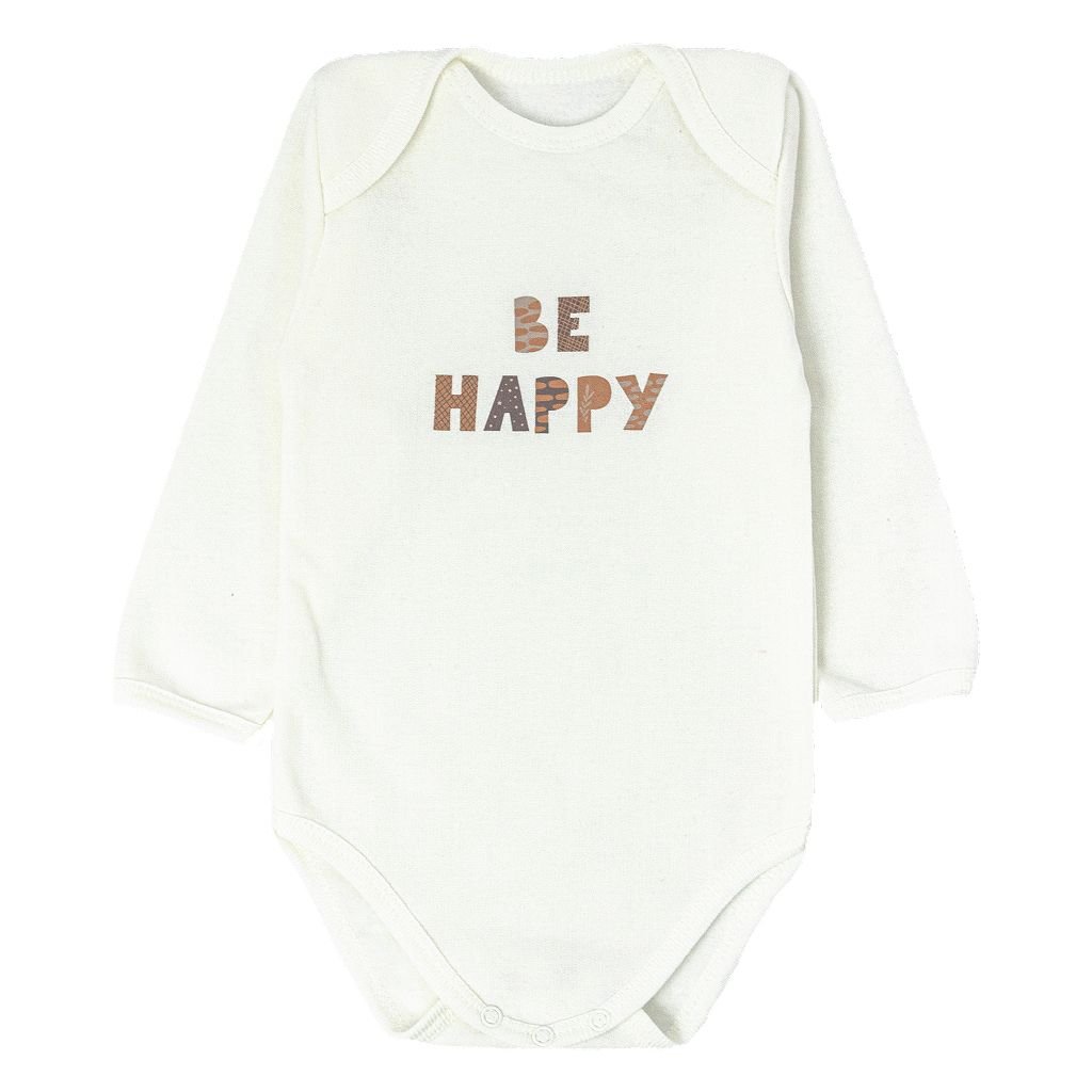 Бодик детский, молочного цвета, надпись Be happy, пошит из натурального хлопчатобумажного начесного полотна. Изделия из такого полотна пользуются большим спросом для малышей, так как обладает многими положительными качествами. Полотно теплое, в то же время очень мягкое и приятное к нежной коже малыша. Не привередливо в уходе, и не кошлатится. Горловина на этом бодике сделана лодочкой, а по низу есть кнопочки. Рукавчики и горловинка, а также низ боди обработаны бейкой. А украшает бодик очень красивая и веселая тематическая покраска по переду изделия.